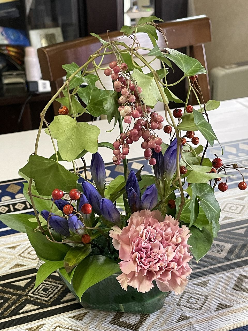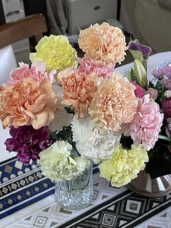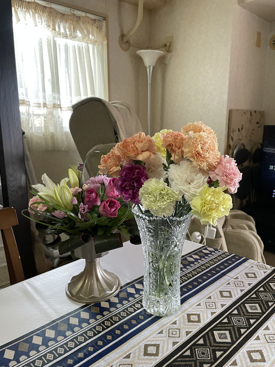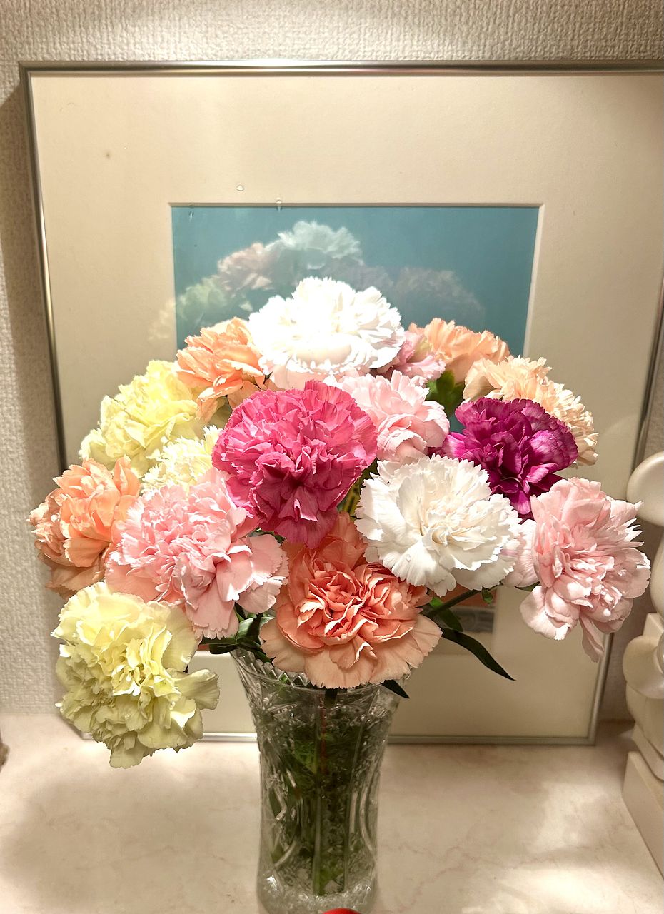 オレンジが多い印象でしたが、とても良いブーケでした。母の日にやってみたかった「色とりどりのカーネーション」、看取って1年後に自宅で実現できました。