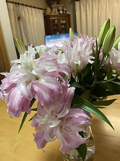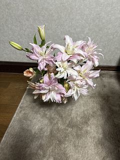 ユリの花が、到着した時、すでに何輪か咲いていました。 その見事な咲っぷりが素晴らしく、しばらく見惚れてから、さっそく水あげを注意書きのとおり、数時間ほどしたあと、飾りました。 色は、かすかにピンクがかかっていて、庭先に、自然の花が咲き乱れるような、錯覚におちいりました。
