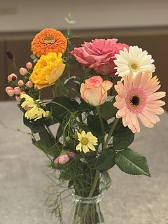 バラの花言葉は「感謝」「上品」、コスモスの花言葉は「乙女の真心」、ガーベラの花言葉は「希望」「前向き」「常に前進」「美しさ」
