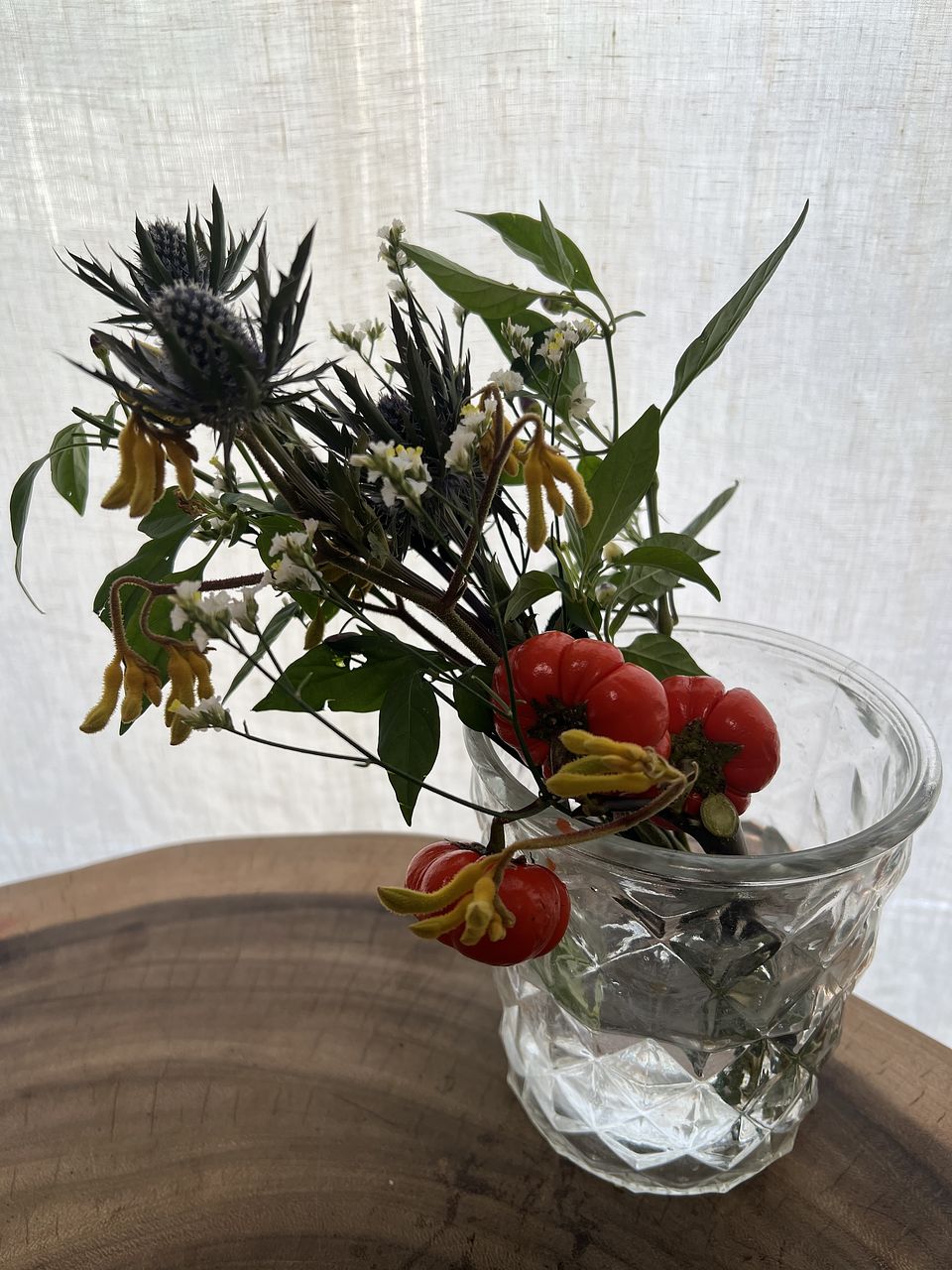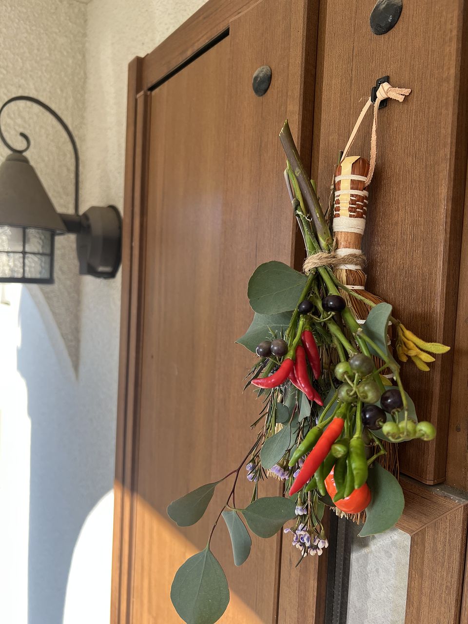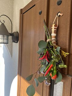 箒よりかなり大きな花束がついていて、スワッグにする分と花びんにいける分がとれました。 ソラナムパンプキンは水分が多そうなのでうまくドライになるか少し心配です。