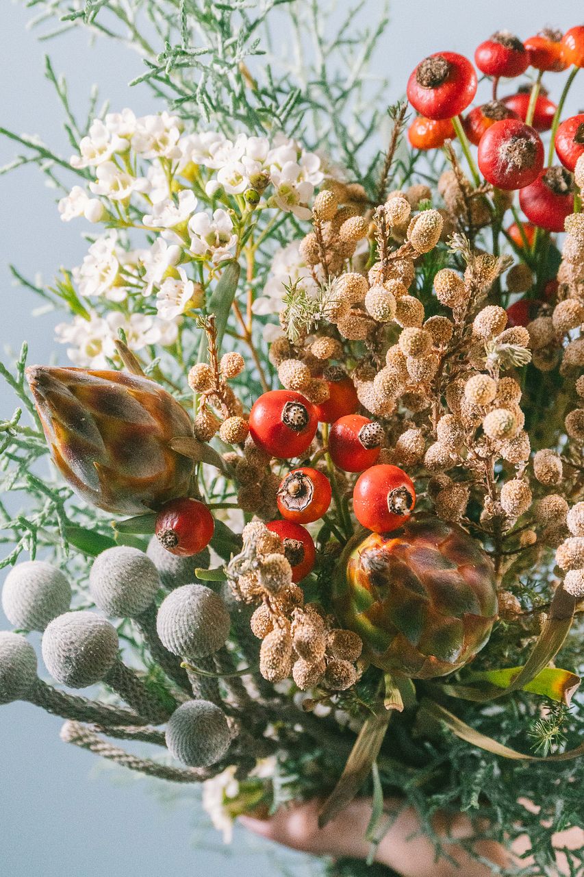 ルビーのようなバラの実がクリスマスらしいポイントに。そのまま吊るしてスワッグにもぴったり。クリスマス気分を長く楽しめます🎄