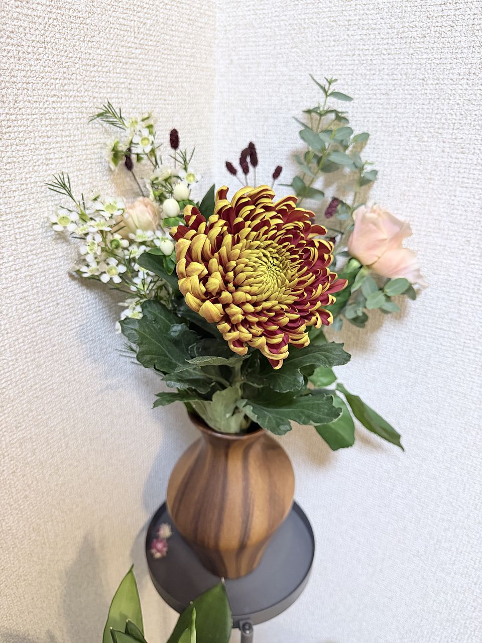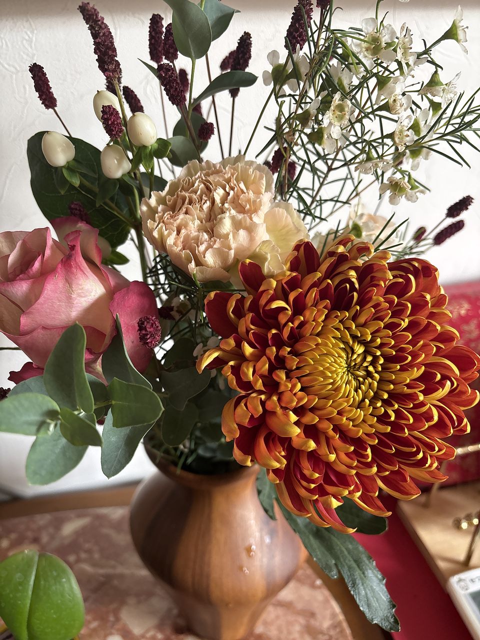 大輪のマムやバラにカーネーション、ユーカリ、ワックスフラワーやユーカリ吾亦紅ととても良いです。 一緒に購入したフラワーベースに早速生けました。