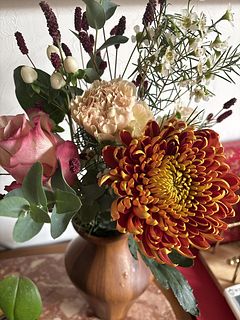 秋満載の素敵な組み合わせの花束でした、包みを開ける時から菊の香りが漂ってきて感激でした、色合いも自分からは頼まないしっとりとした落ち着きのある和室に似合いそうです、ときめく提案をありがとうございました。