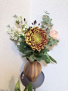 一気に秋色になり綺麗なお花でした。 菊を飾るって縁起の悪いイメージがしてましたが、 この花束で、初めてマムのお花の素敵さを感じています。開いてきたらどんなふうに変化するのか楽したみです。