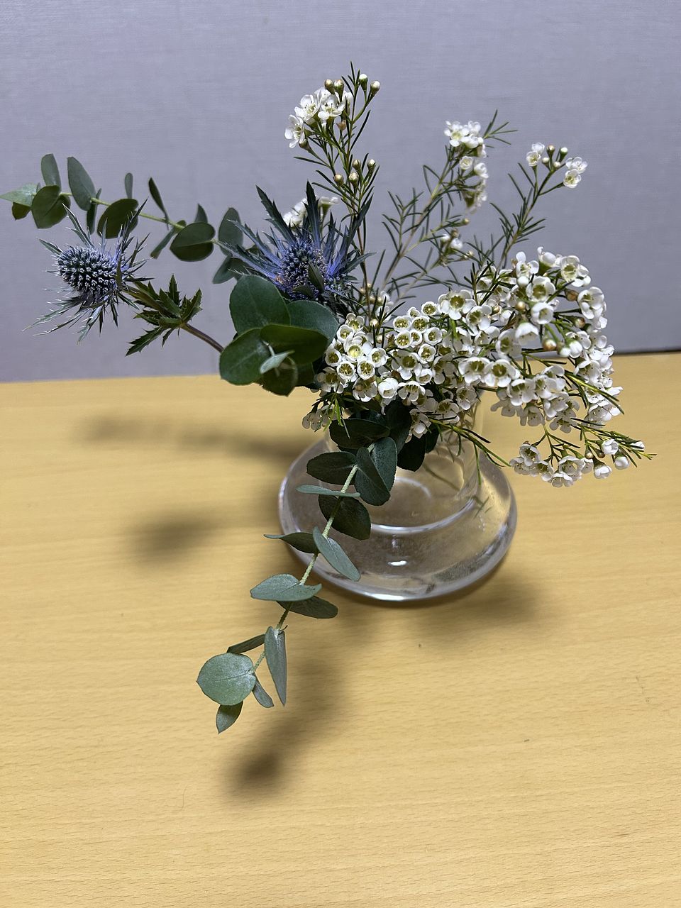 ワックスフラワーやエリンジウムを組み合わせて。ドライに向いてるお花をセレクトしています。ユーカリの香りも楽しんで! ワックスフラワーは葉っぱをこするととっても良い香り。