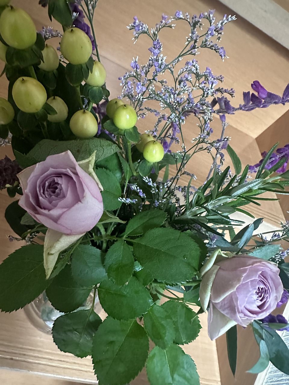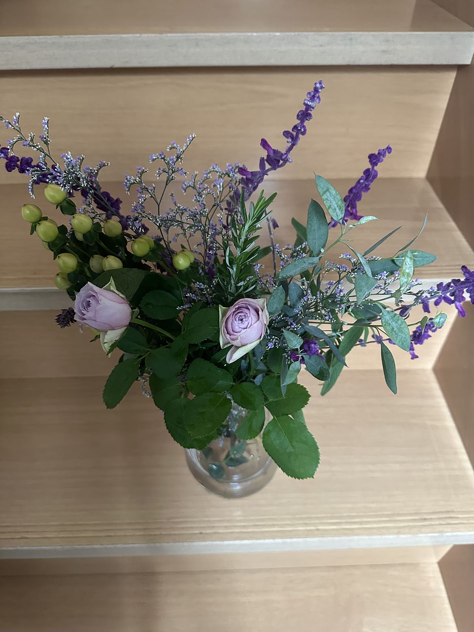 リラックス効果があるとされるアメジストセージを主役に豊かな香りのハーブやユーカリを合わせました。ラベンダーカラーのバラがチャームポイント💜