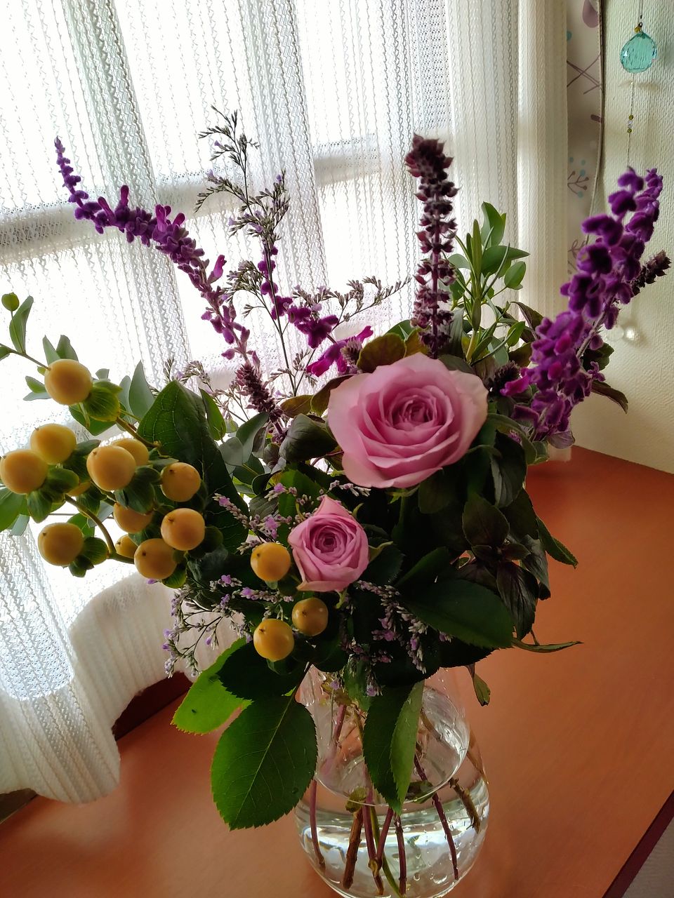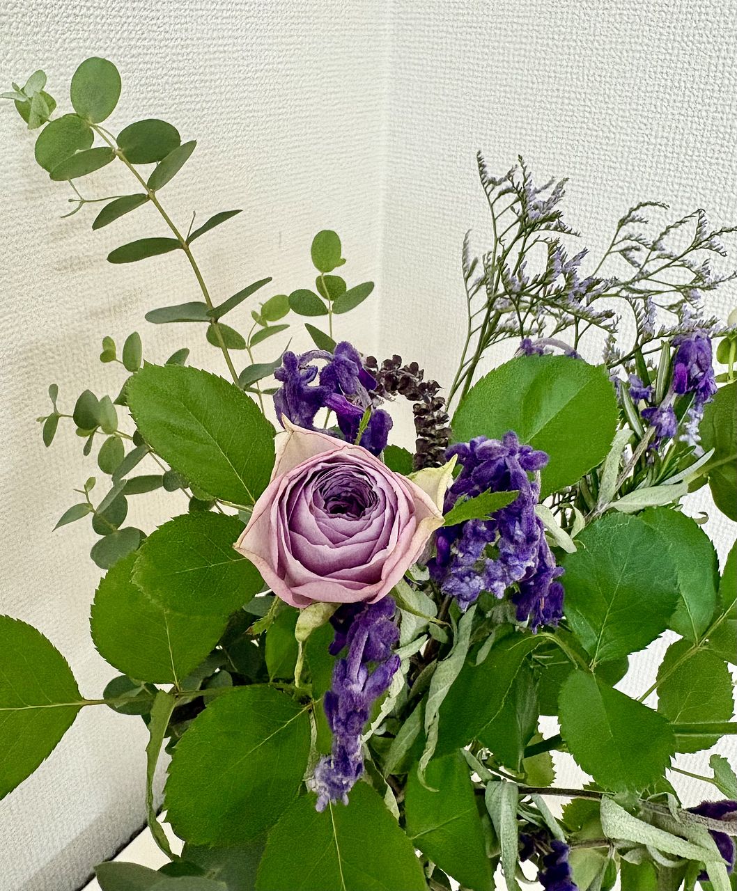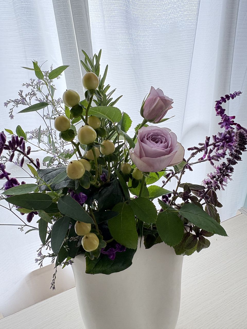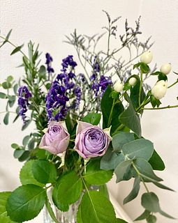 セージの香りがふわっと漂って、とても癒されます。紫のバラが良いアクセントになって素敵なブーケです。ありがとうございます!(´▽`)