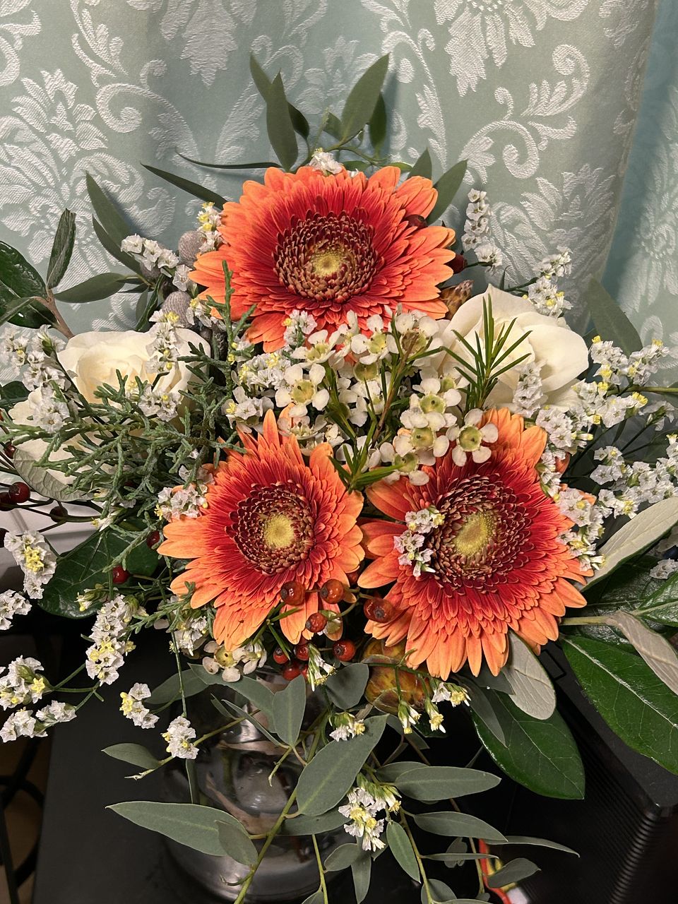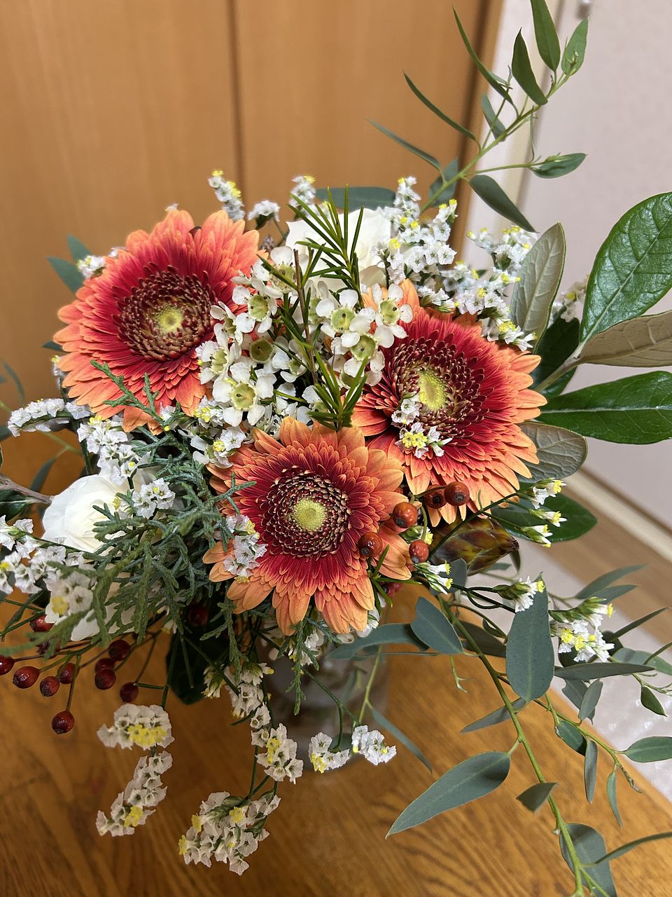 スパイラルに組まれていて葉の処理もしてあるのでそのまま飾って楽しめます。たっぷり入っているので華やかです。内容は毎回おまかせです、お楽しみに!