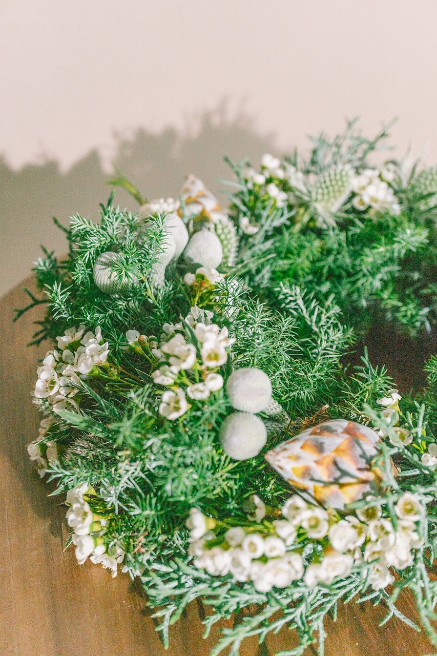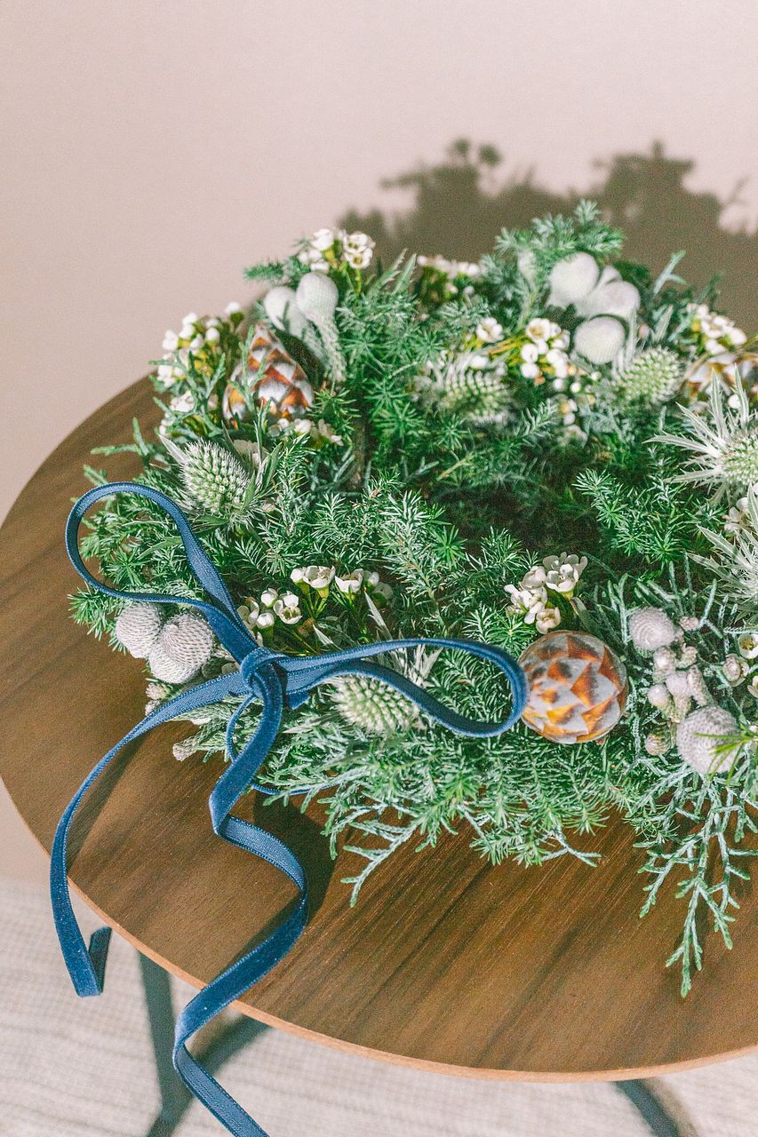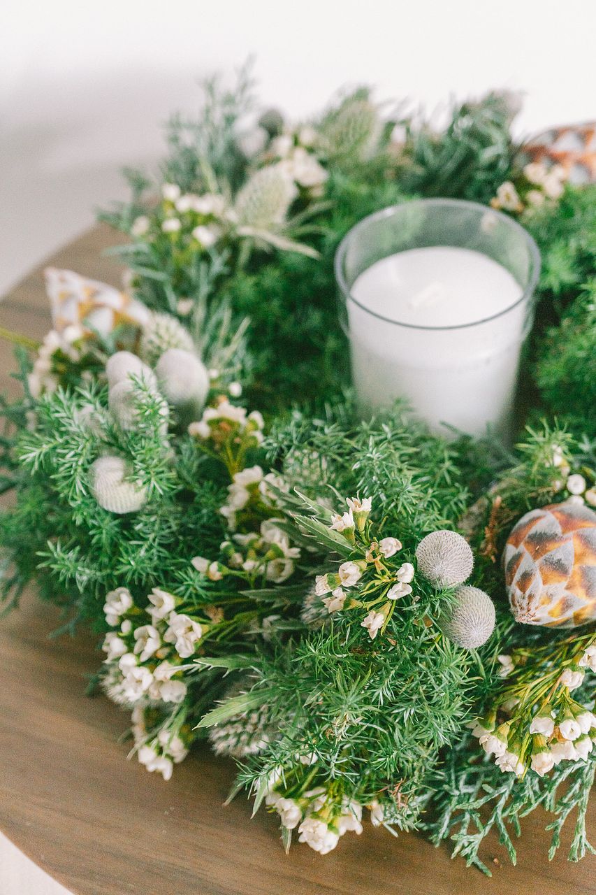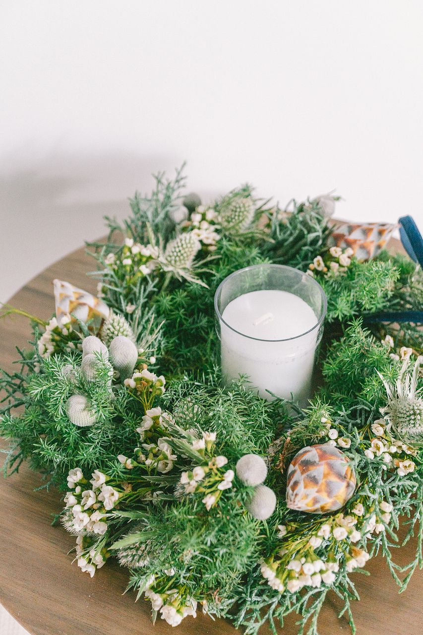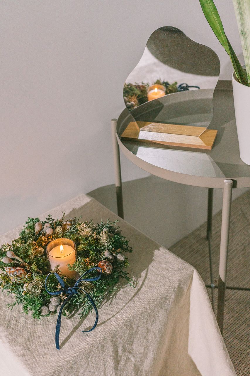 中央にはキャンドルを。火を灯せばやさしい光がリースのグリーンを照らして、まるで森の中の小さな灯りのよう🕯️🧚