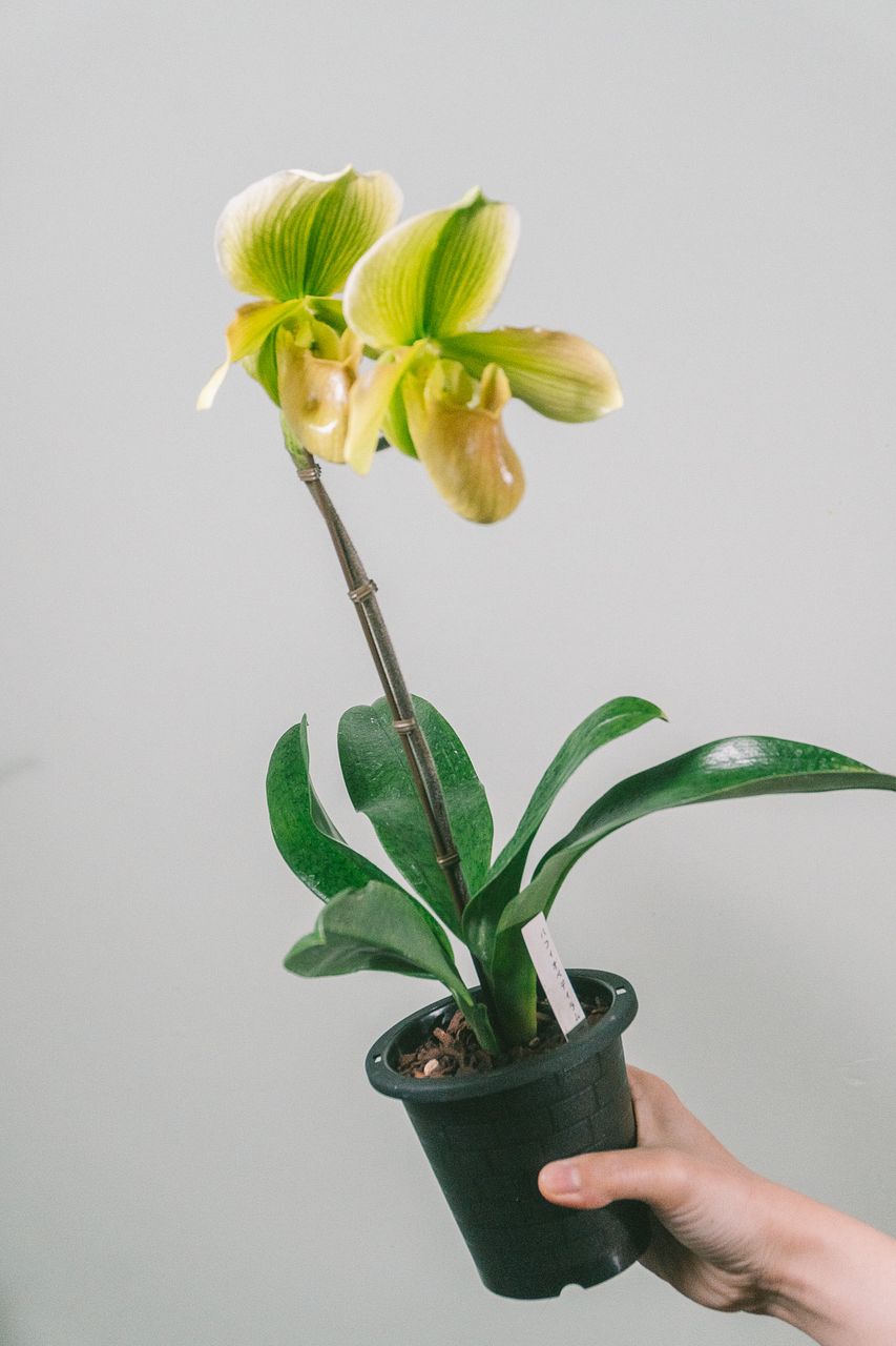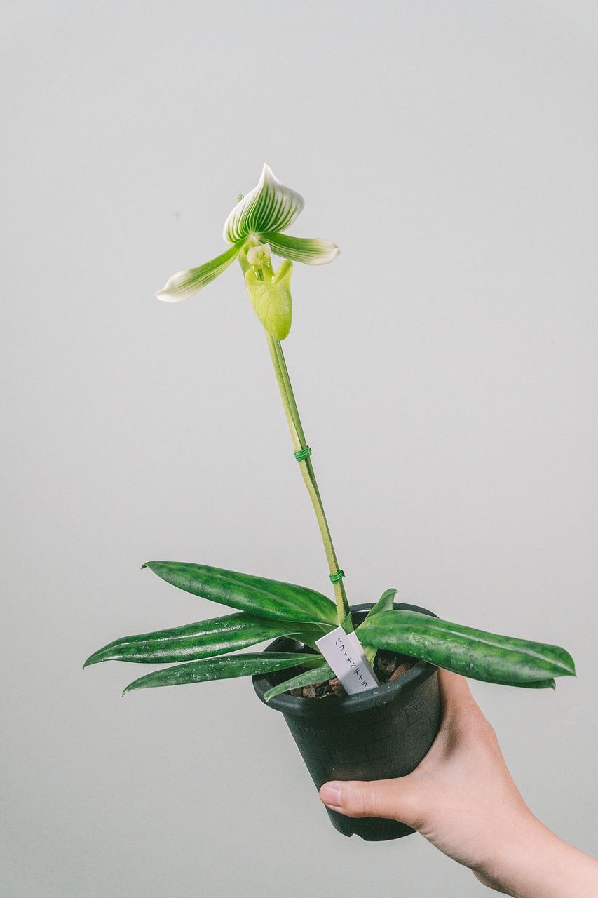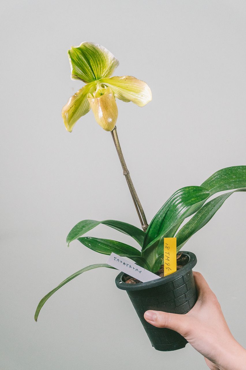 淡いグリーンがかったクリームイエローの花に、赤褐色の模様がほんのりと差す優雅な姿。