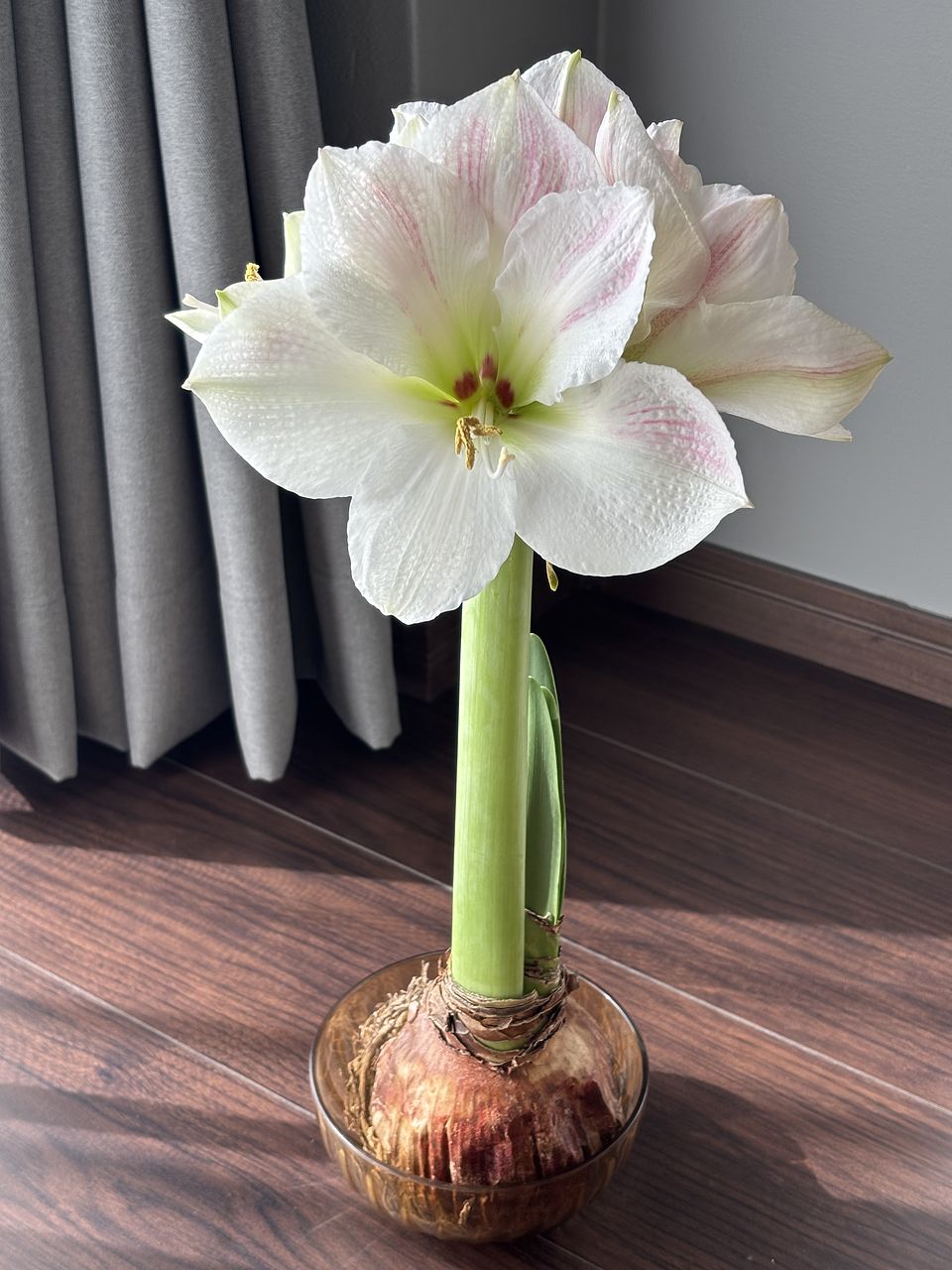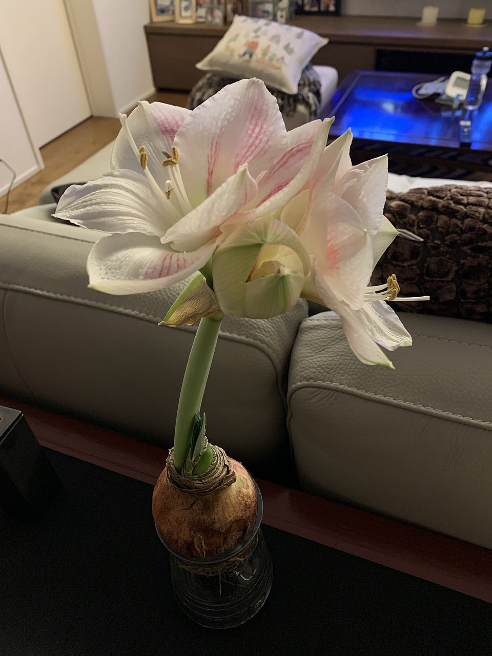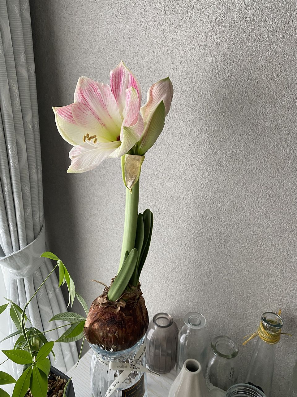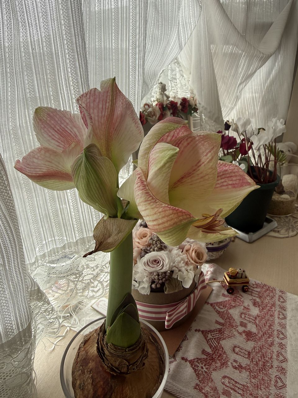 昨年の12月の23日に届いてほぼ2ヶ月です。 あと蕾が2つ、凄く豪華で華やかなお花に気分も爆上がりです🥰✨🙌 もう一つ芽が3センチほど伸びていますが多分球根には余力は残ってないだろうなあ🥲 何というか、とにかく咲くまでに時間がかかった分情みたいなものが移りますね。とても楽しい毎日でした。 また機会があれば育てたいです。(何もしませんが(笑))