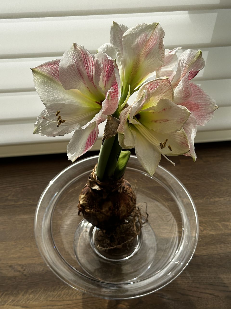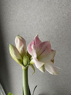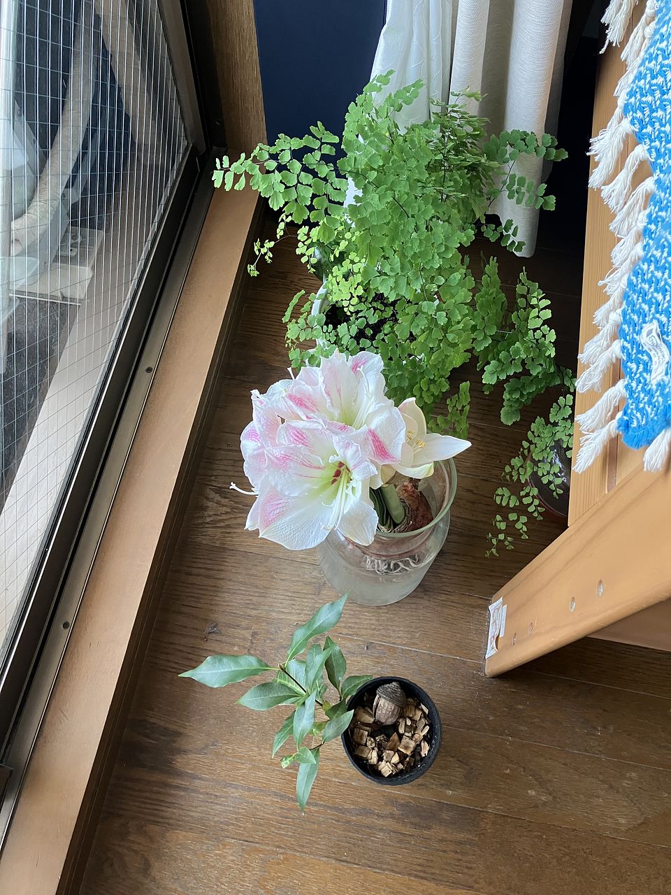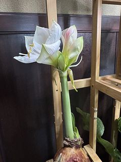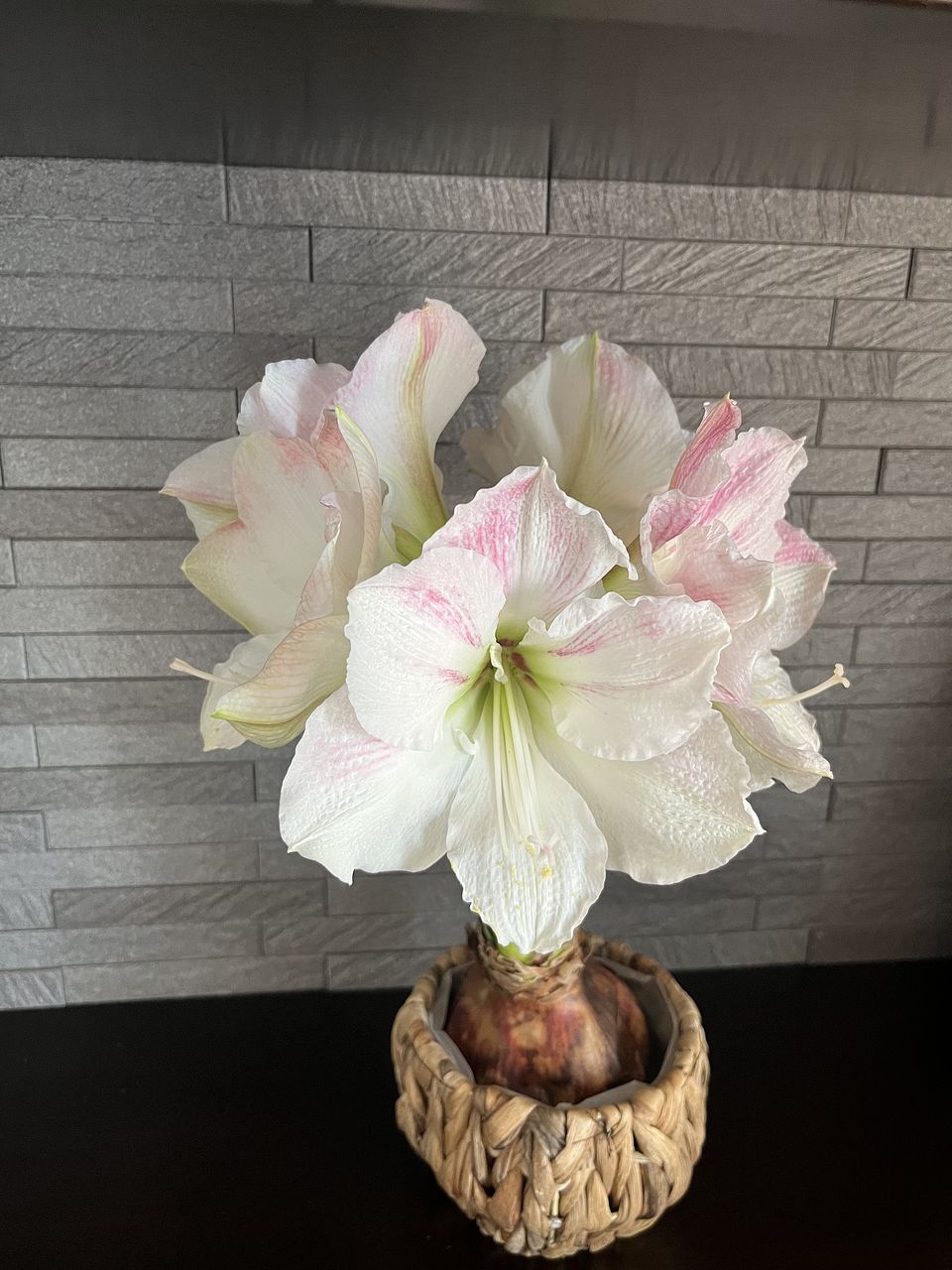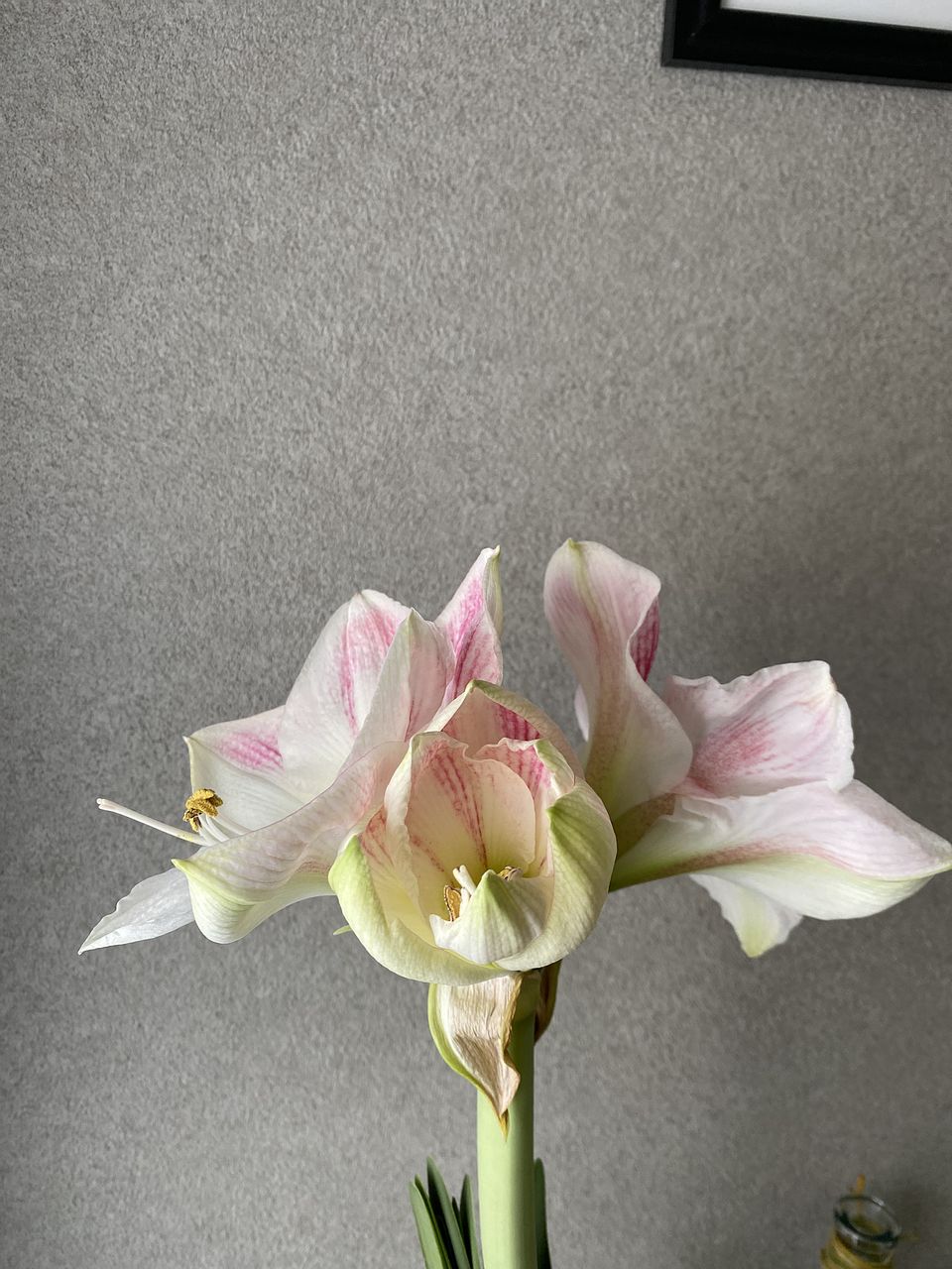 昨年の12月の23日に届いてほぼ2ヶ月です。 あと蕾が2つ、凄く豪華で華やかなお花に気分も爆上がりです🥰✨🙌 もう一つ芽が3センチほど伸びていますが多分球根には余力は残ってないだろうなあ🥲 何というか、とにかく咲くまでに時間がかかった分情みたいなものが移りますね。とても楽しい毎日でした。 また機会があれば育てたいです。(何もしませんが(笑))