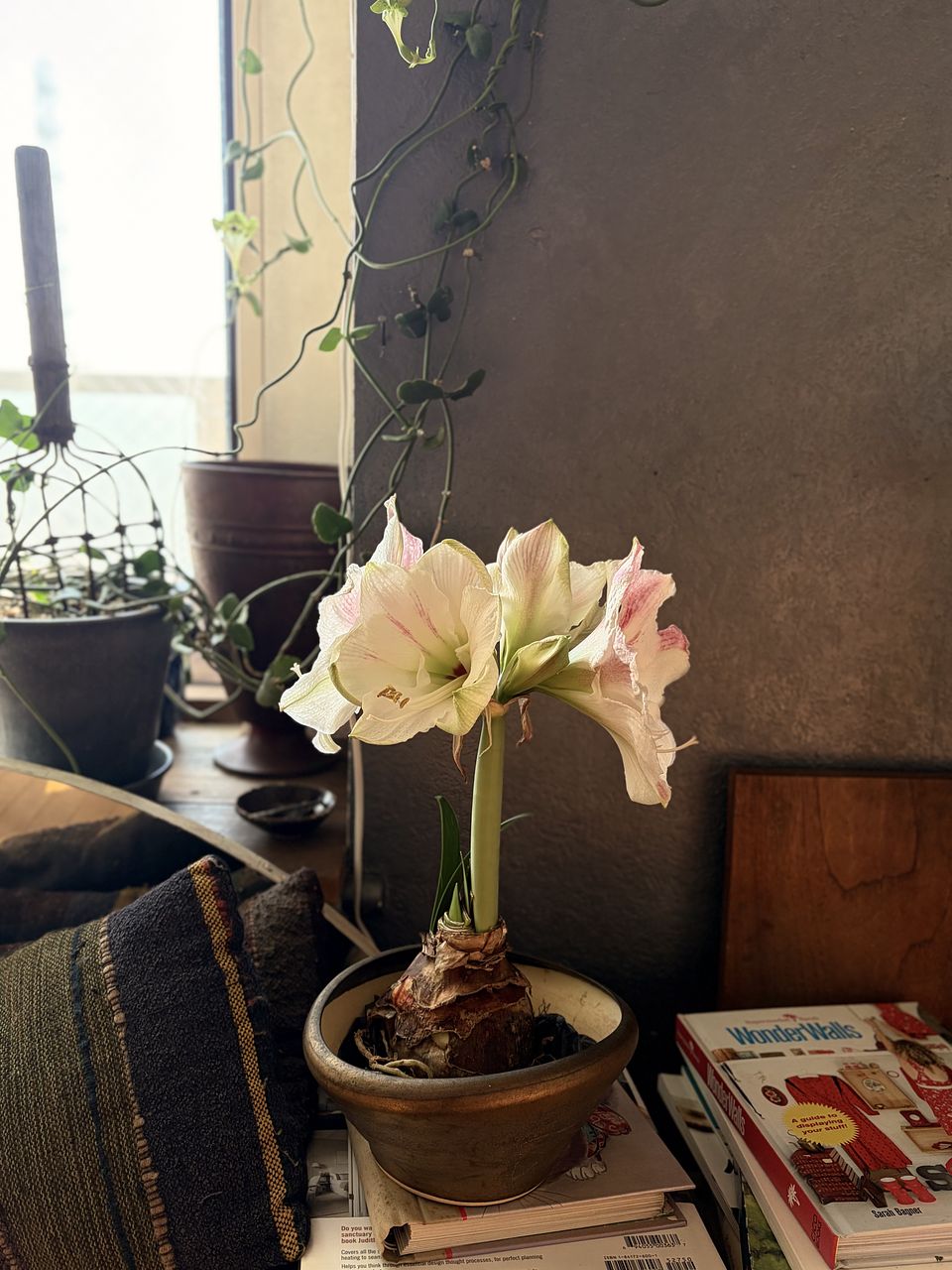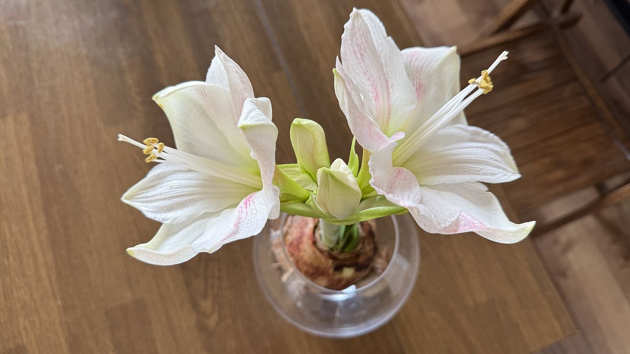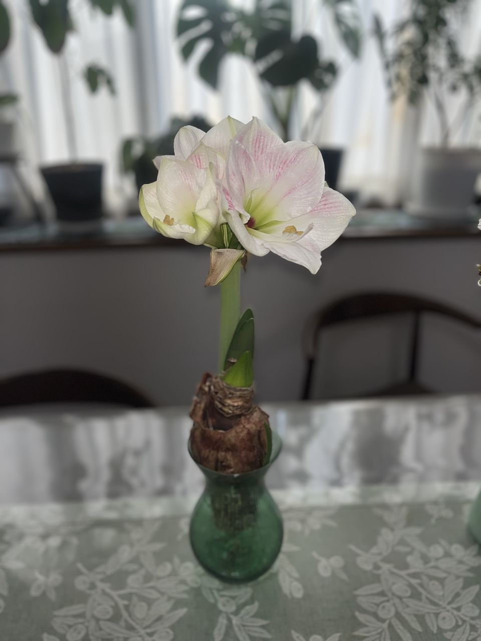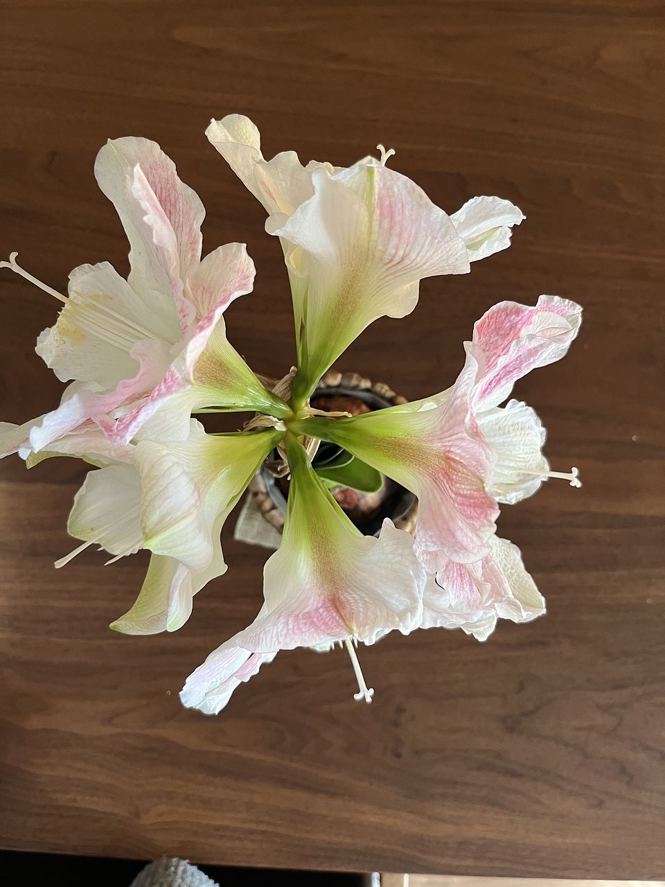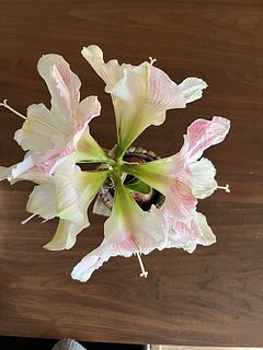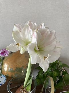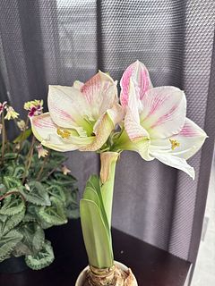 昨年の12月の23日に届いてほぼ2ヶ月です。 あと蕾が2つ、凄く豪華で華やかなお花に気分も爆上がりです🥰✨🙌 もう一つ芽が3センチほど伸びていますが多分球根には余力は残ってないだろうなあ🥲 何というか、とにかく咲くまでに時間がかかった分情みたいなものが移りますね。とても楽しい毎日でした。 また機会があれば育てたいです。(何もしませんが(笑))