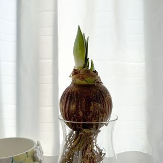 思っていたより大きな球根が届きました。 何に入れていいか分からなかったので、使わなくなったコーヒーを淹れるやつに入れてみました。 この先、どう成長していくのかとても楽しみです!
