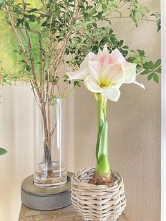 大きくて根っこもあり土が少しついていて無骨!口の広いガラスベースに梱包材として入っていた紙をくしゃくしゃと入れて乗せてみました。これで伸びても転がらないかな?我が家の球根コーナーでどっしりとした佇まいで春を待っています…(写真左奥がそれです)