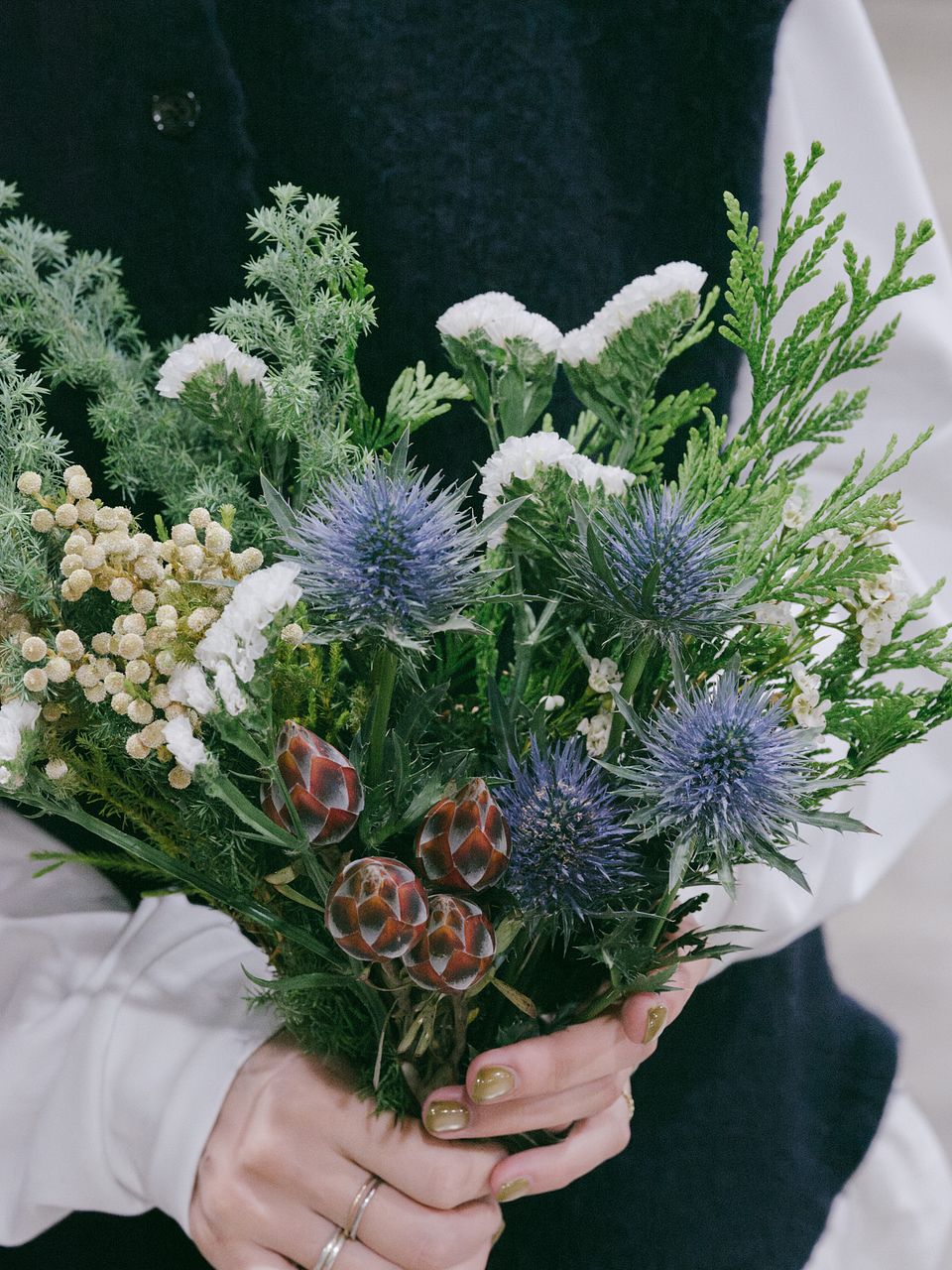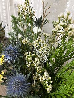 ヒバなど深い森の香りが楽しめるグリーンと、エリンジウムなど涼しげな花を合わせました。