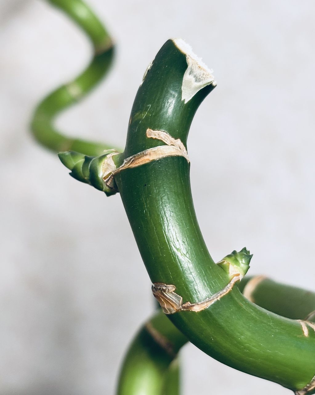 幸せ呼んでくれると信じてヘビのような珍しい姿が印象的なバンブー購入しました。根が生えていました。管理はどうしたら良いのでしょうか?わからないからとりあえず長めのシリンダーにぶっ込んでみました。 成長が楽しみです。 あれから約1ヶ月が経ちました。 6本中1本は黄色く変色してダメになってしまいました😢 が、残りの5本は青々とすくすく育っています。 1本、芽も何も生えていない子がいましたが、2箇所からかわいい芽が出て来ました。2箇所から芽が出ているのはこの子だけです。本当にかわいい💕