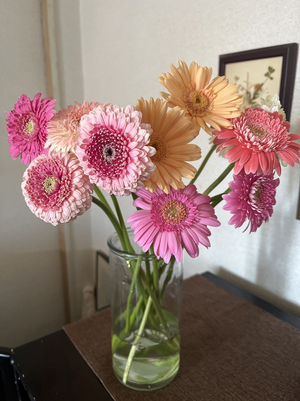 アプリコットピンクやコーラルピンク、ホワイトピンクなどニュアンスカラーのガーベラをギュッと束ねました🍑ころんとした咲き方が最高にキュート🥰