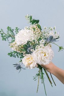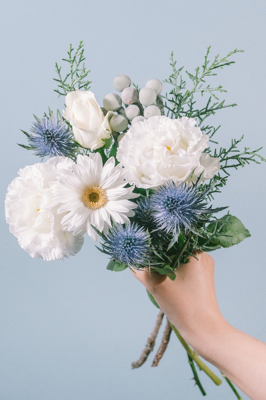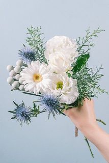 ふんわりとしたトルコキキョウやガーベラ、バラの白は澄んだ空気のような透明感。ユーカリの質感とブルーの差し色はクリーンな印象に。。