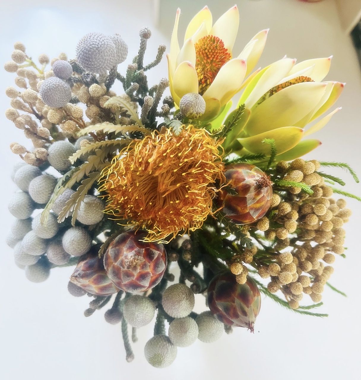 木の実のようなネイティブフラワーを中心に束ねることで、ナチュラルで落ち着いた雰囲気に。