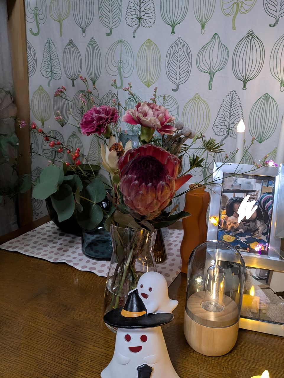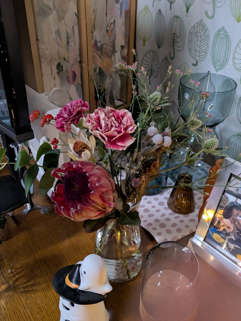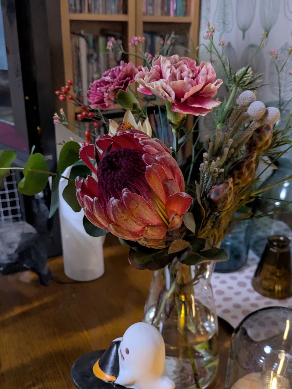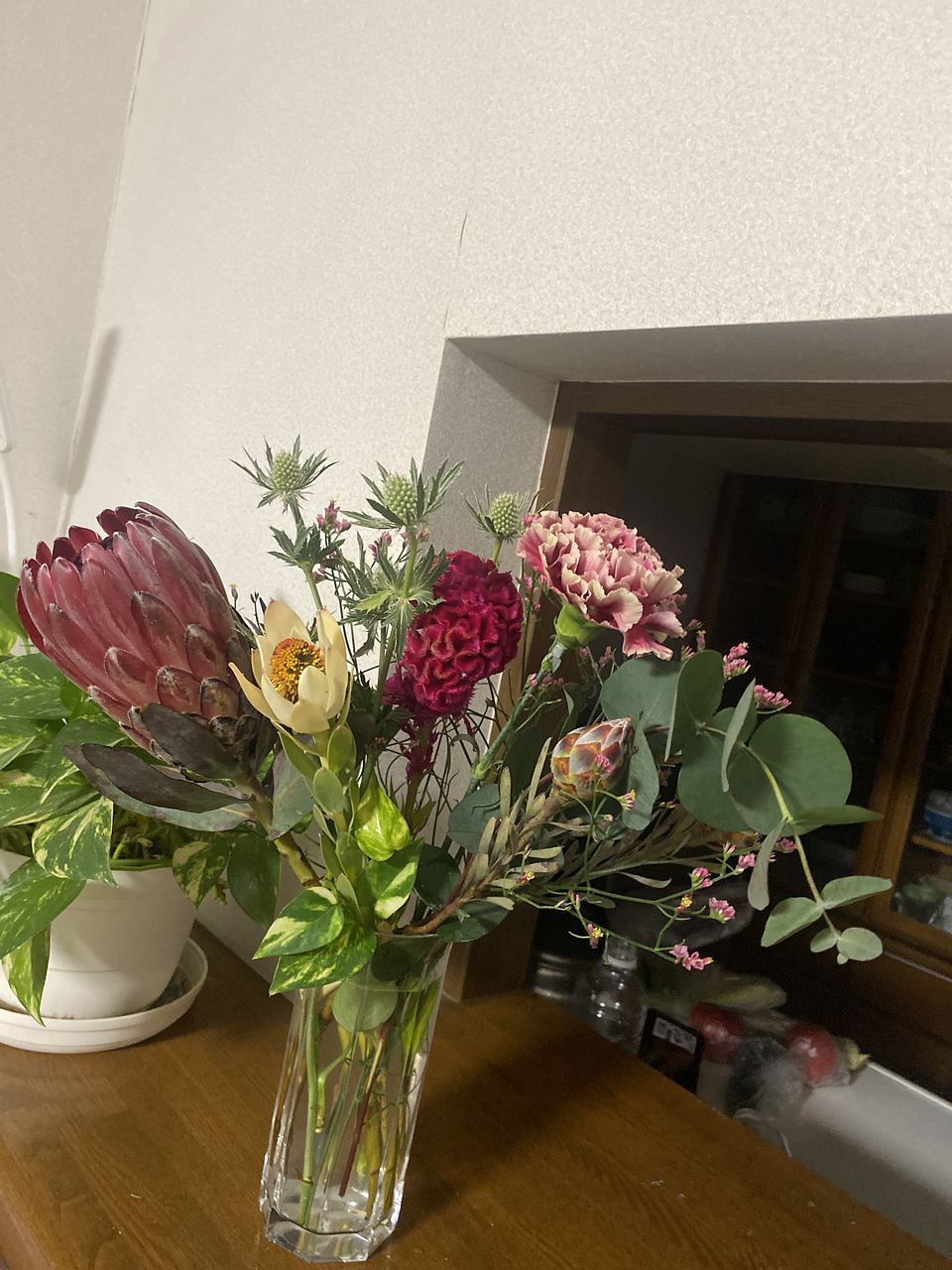 花材を少し足しましたが、何とかまとまったかな? プロテアを活けて見たかったから、嬉しい😃