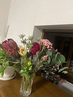 プロテアはもちろん、珍しいお花がたくさん含まれていて、ゴージャスでした。新鮮かつボリュームもたっぷりで、普通のお花屋さんでは、このお値段では手に入らないだろうと思います。 一緒に買った花器に生けましたが、本当に素敵でうっとりします。 追記 : 数日生花で楽しみ、名残惜しさを感じつつスワッグにしてみました(けいとうは赤が強すぎたので、スワッグにはせず一輪で飾ってます)。素敵なドライフラワーになっていく過程を楽しめたらと思います。