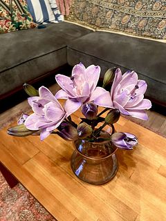 幻想的なラベンダーカラーに染まった百合。八重咲きの品種なので、花粉はほとんどありません。花びらはとても繊細で、傷がつきやすいです。気になる場合は、優しく取り除いてください。
