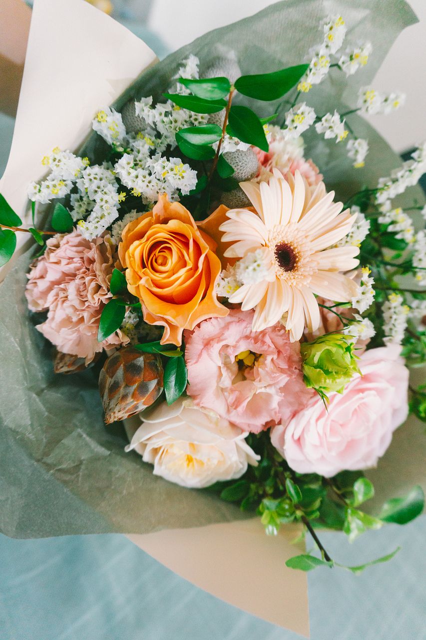 お花の内容はおまかせですが、オレンジ、ピンクのバラ、トルコキキョウ、ガーベラなど明るいカラーリングのブーケをお届けします。