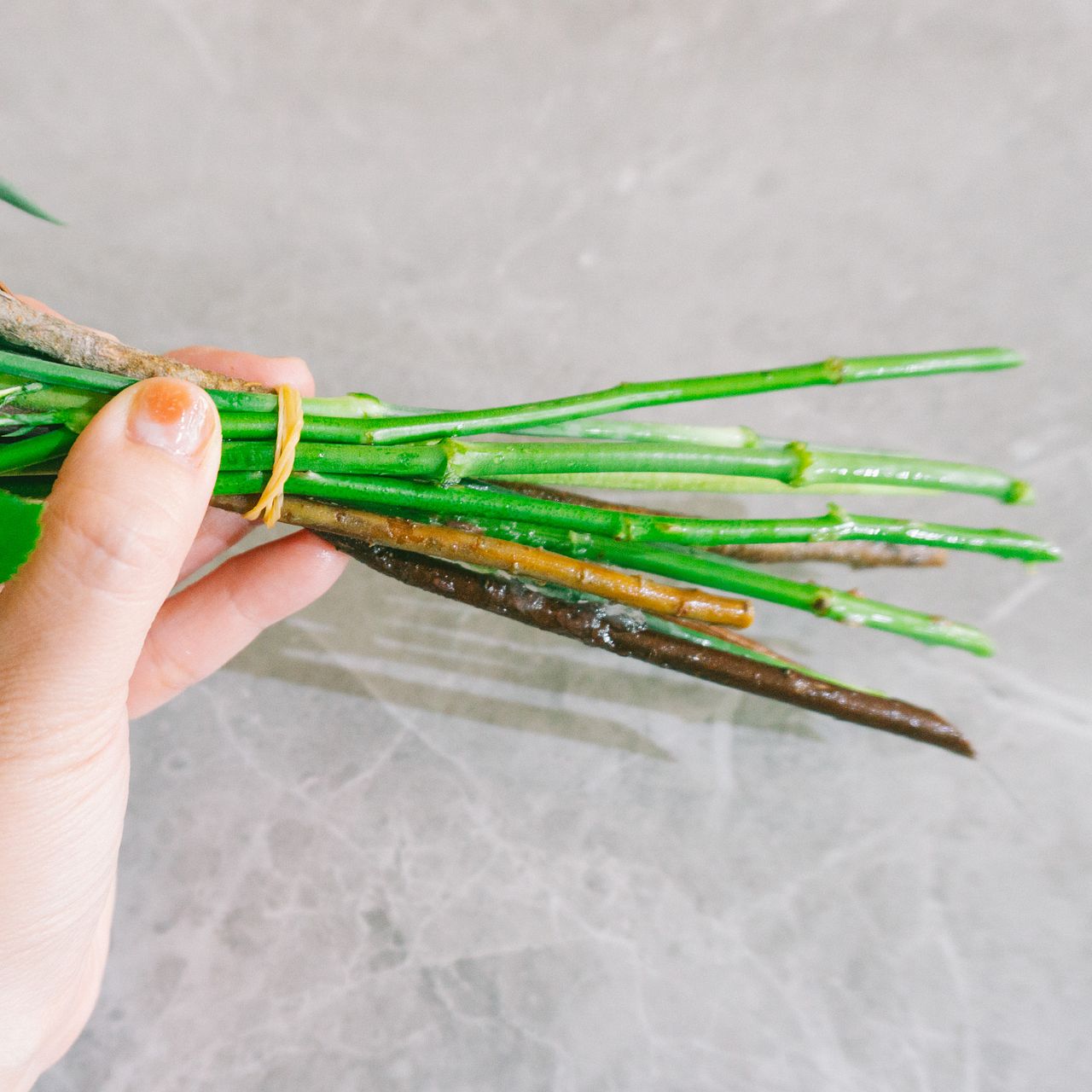 スパイラルに組んでいる状態なので、すぐに飾ることができます。水揚げのために茎は1〜2cmカットしてください。