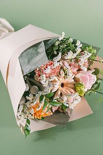 「絆」、「信頼」が花言葉のオレンジのバラ、「感謝」が花言葉のピンクのバラや「希望」が花言葉のトルコキキョウなど、フローリストが厳選した季節のお花をスパイラルに束ねて、ラッピングした状態で1束お届けします。