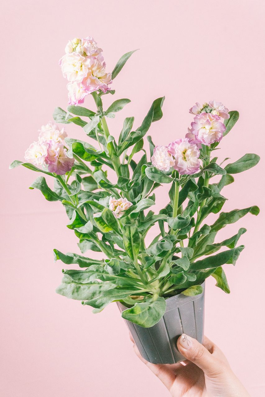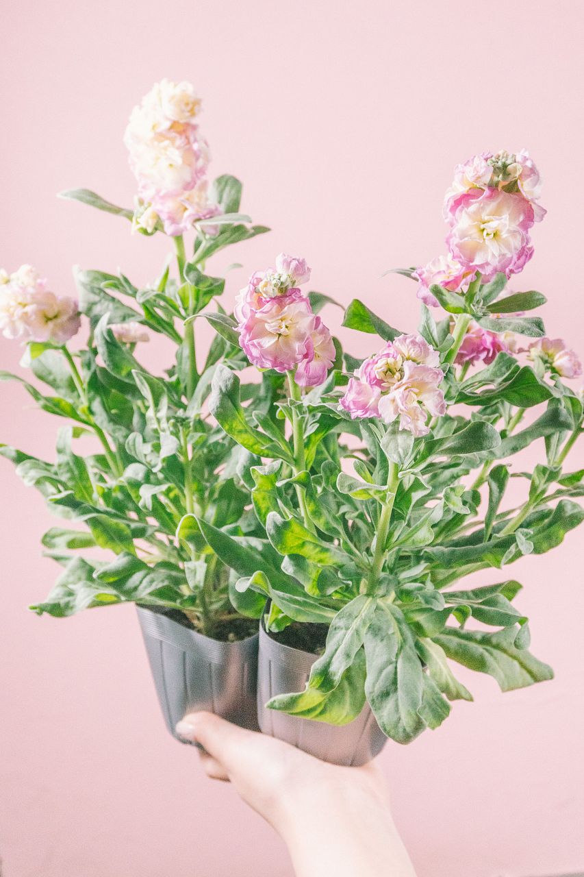 ツートーンストック「ベイビーレインボー」が初入荷。外側が淡いピンク、内側がクリームイエローに色づく柔らかなグラデーションが美しい八重咲きのストックです🩰🐣