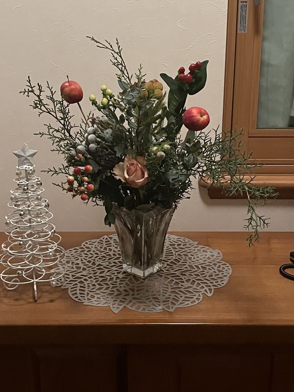 バラはまだ蕾ですが、クリスマスらしい華やぎと香りが玄関に充満しています。アップルがキュート🩷