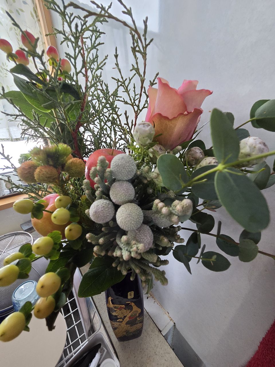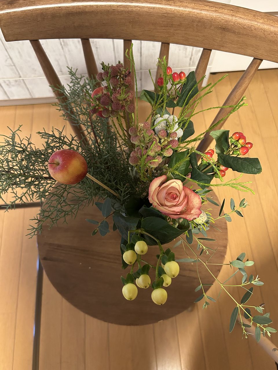 思った通りの素敵なお花が届きました!林檎がかわいくアクセントになっていて、淡い薔薇の色や他のお花や植物と合っていてとても良かったです☺️