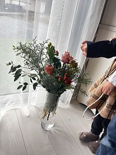 とても可愛かったですが、コニファー?の葉っぱが思っていたボリュームの2倍くらいあり、花よりも匂いが強く、スーッとする匂い、そしてちょっとベタつきがあります。匂いは私は好きでしたが好みが分かれるかも知れません。たまたま花瓶が割引で買えたので大きいファゴットの花瓶を購入していたのですが、それがないと全部入りきらなかったです笑 夫の誕生日用に購入しましたがクリスマスまで持たせて楽しみたいと思います!