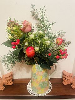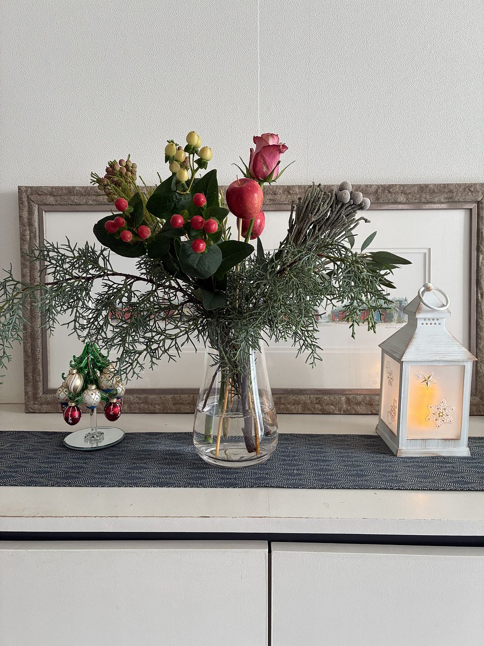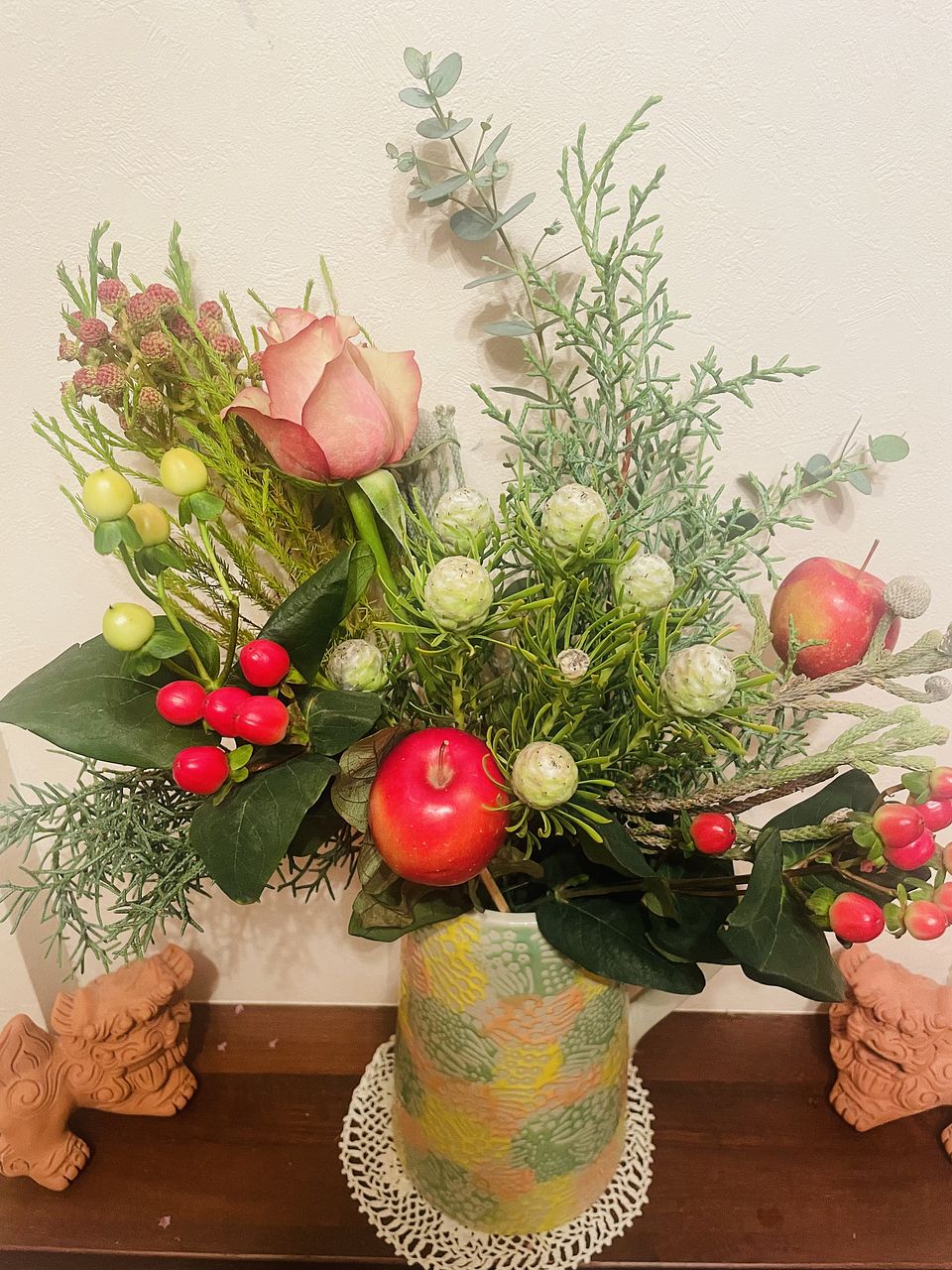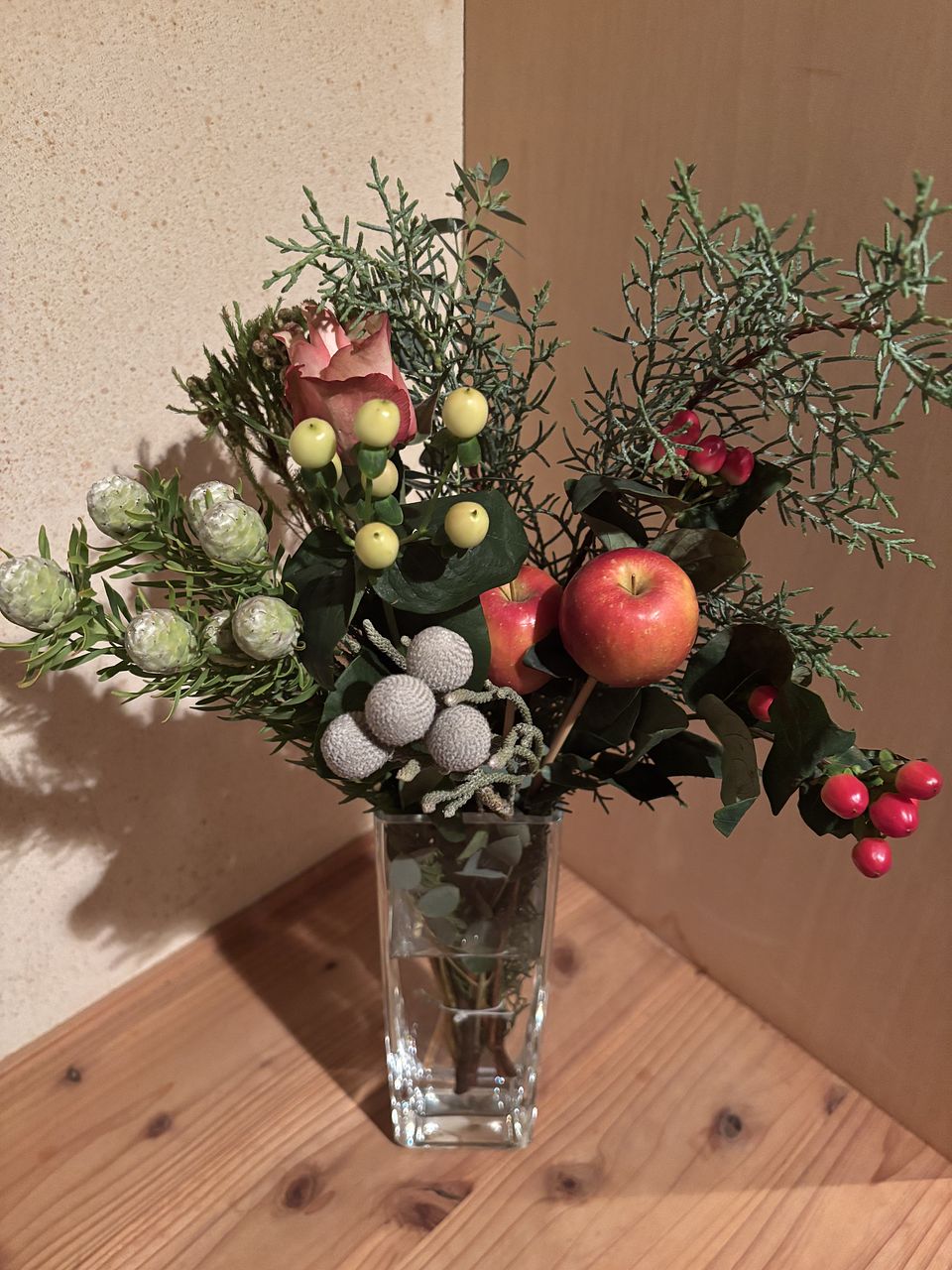 クリスマスぽいけど、クリスマス過ぎない感じがとても気に入ってます。 大人のクリスマス、実のような植物があって自然な感じで素敵でした。りんご🍎がとっても可愛くて、インパクトになってます。 ボリュームあって、想像通りでとても嬉しいです。