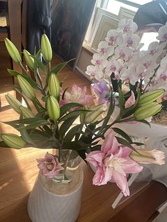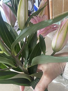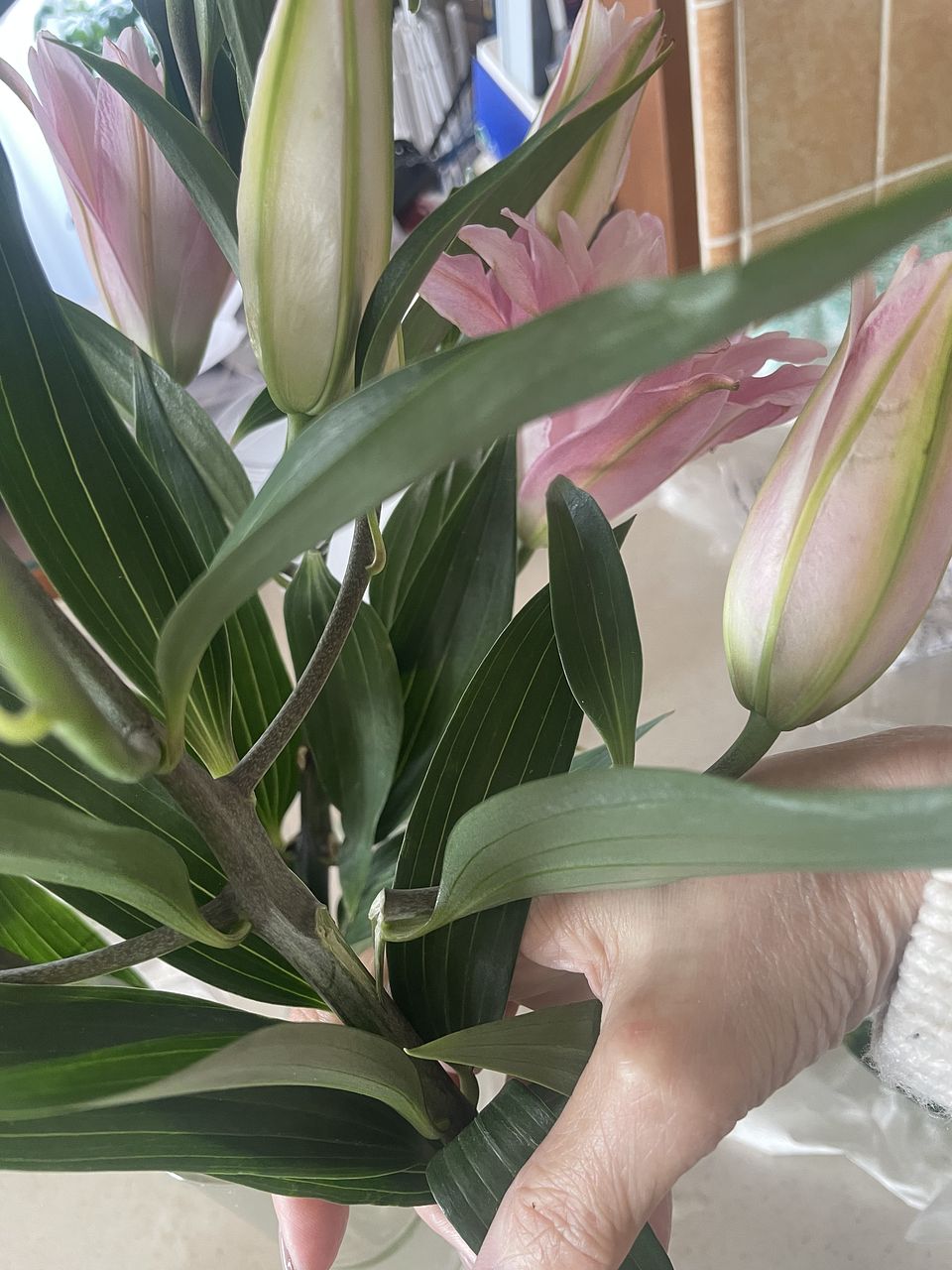 ピンクとホワイトのドレスのような花びらがとても美しい😍つぼみも沢山あるので、長く楽しめそうです♪3本ですが、大きめの花束位、かなりなボリュームです。ユリが大好きな母へのプレゼントに🎁✨ありがとうございました❣️