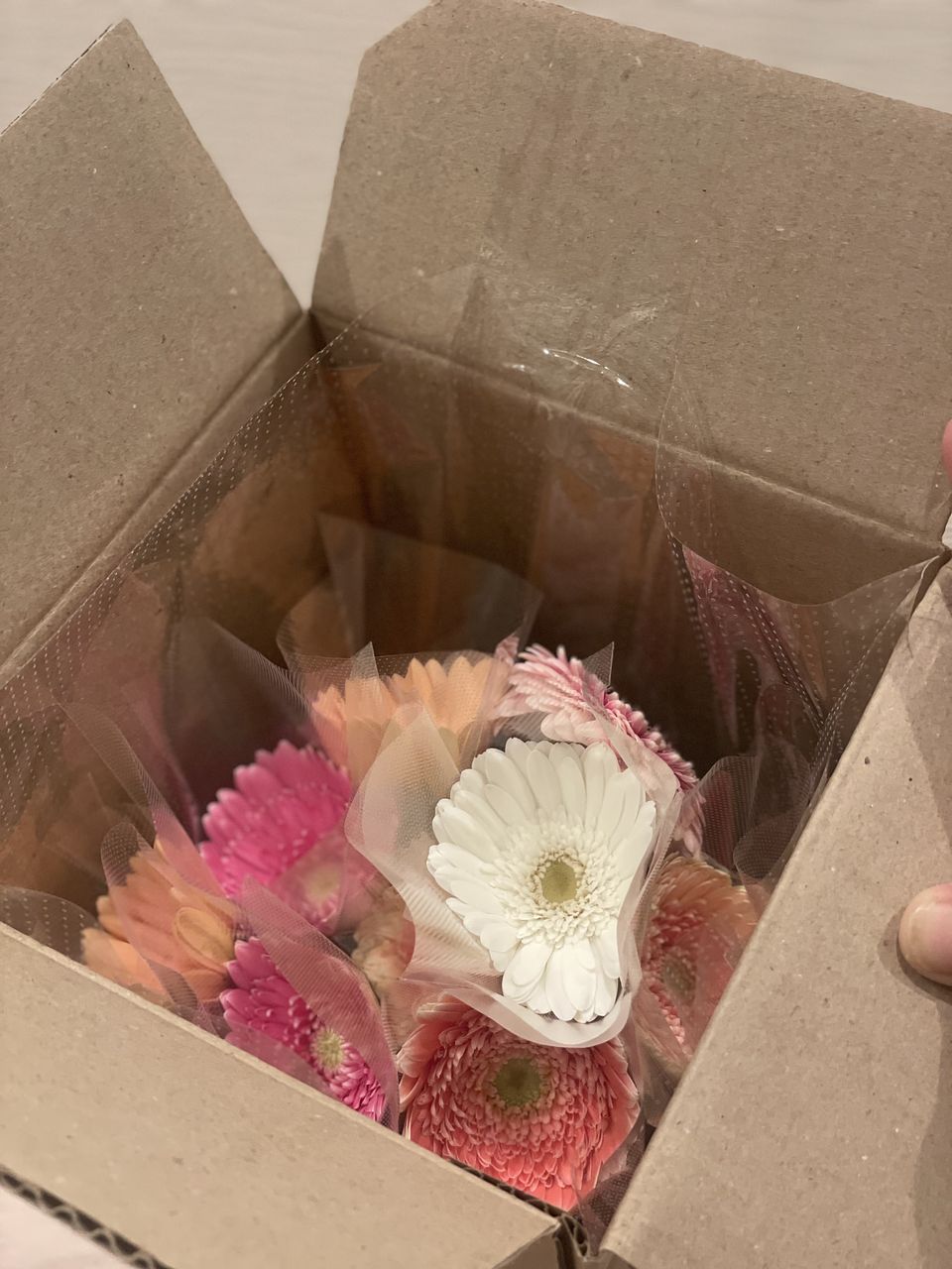 アプリコットピンクやコーラルピンク、ホワイトピンクなどニュアンスカラーのガーベラをギュッと束ねました🍑ころんとした咲き方が最高にキュート🥰