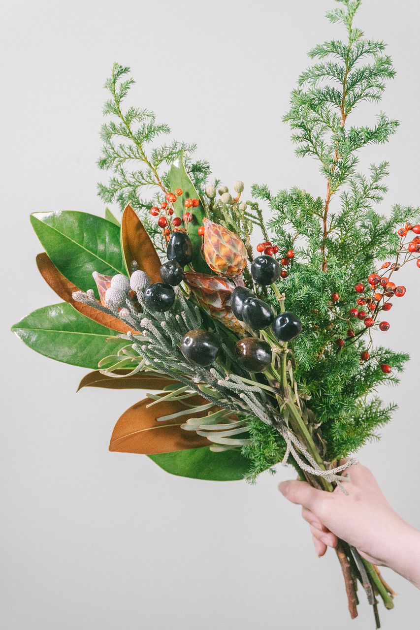 レッドやピンク、パープルの彩りに、グリーンの葉や実物を合わせることで、幻想的でドラマティックな雰囲気を演出します。