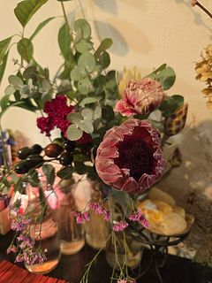 プロテアはもちろん、珍しいお花がたくさん含まれていて、ゴージャスでした。新鮮かつボリュームもたっぷりで、普通のお花屋さんでは、このお値段では手に入らないだろうと思います。 一緒に買った花器に生けましたが、本当に素敵でうっとりします。 追記 : 数日生花で楽しみ、名残惜しさを感じつつスワッグにしてみました(けいとうは赤が強すぎたので、スワッグにはせず一輪で飾ってます)。素敵なドライフラワーになっていく過程を楽しめたらと思います。