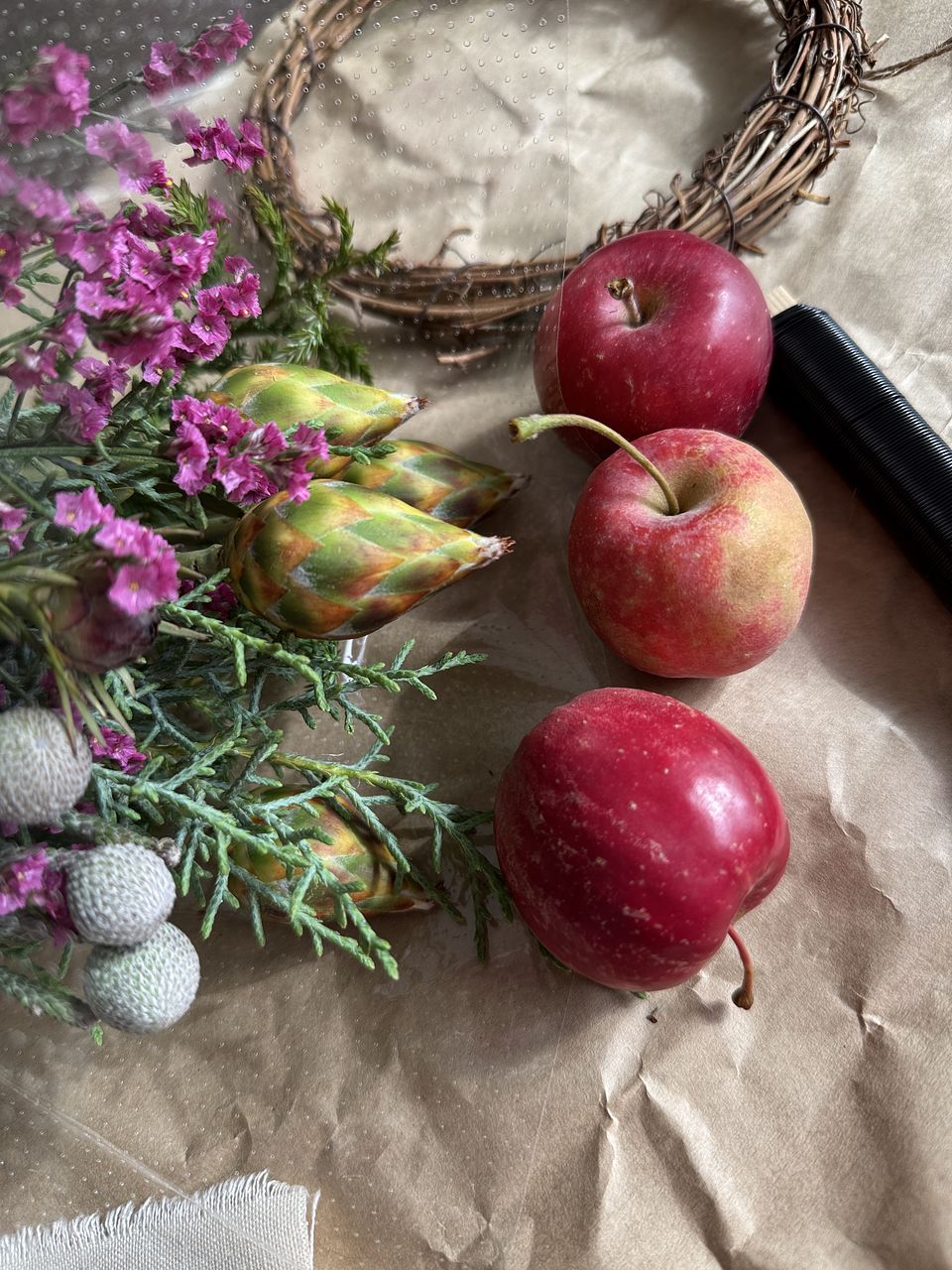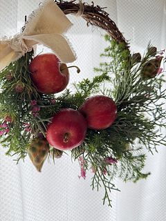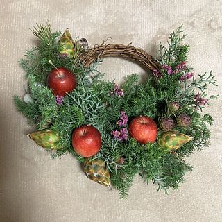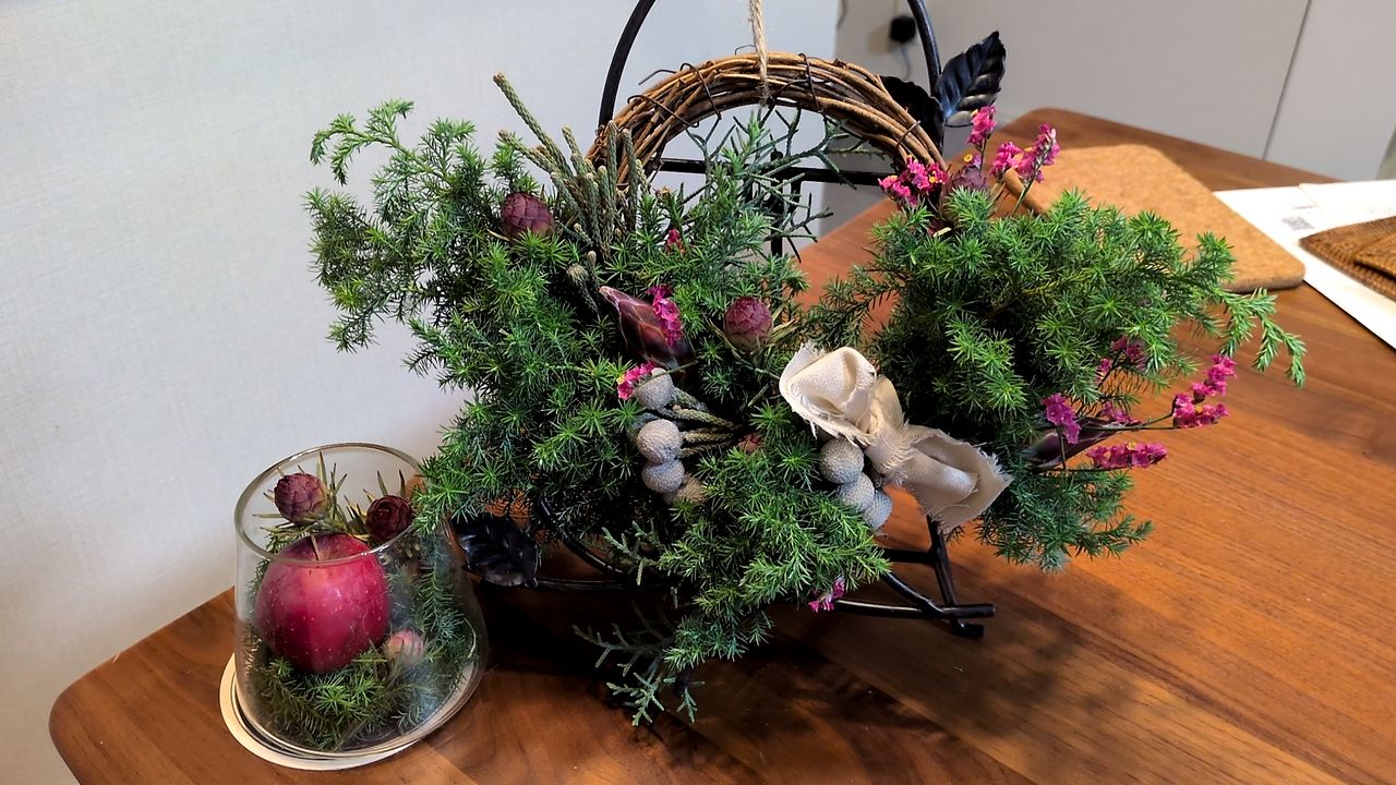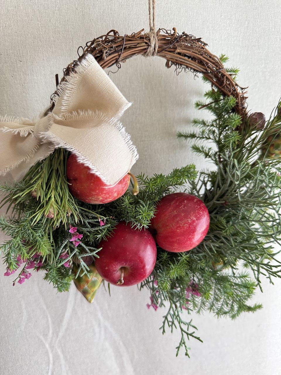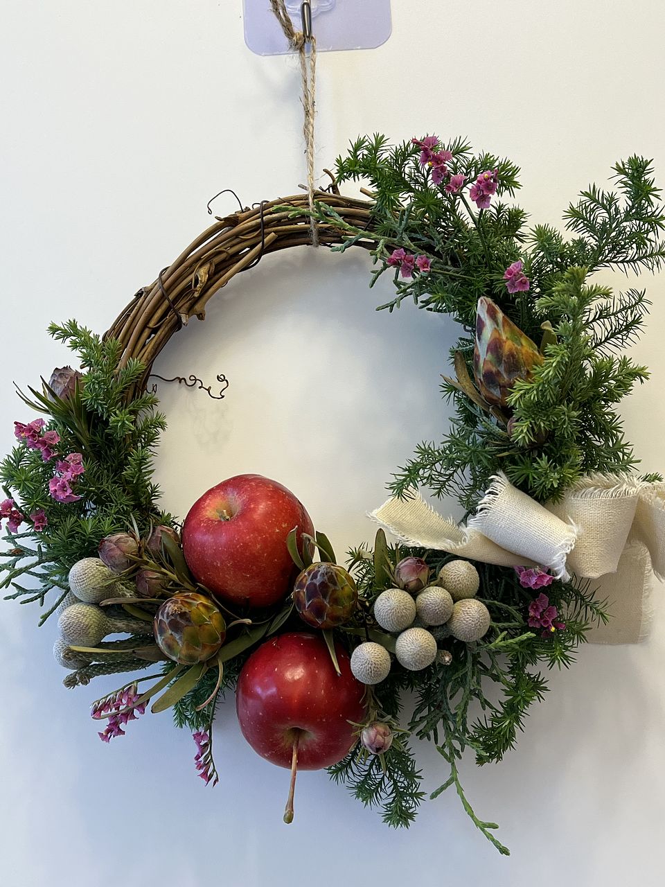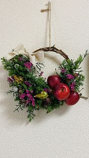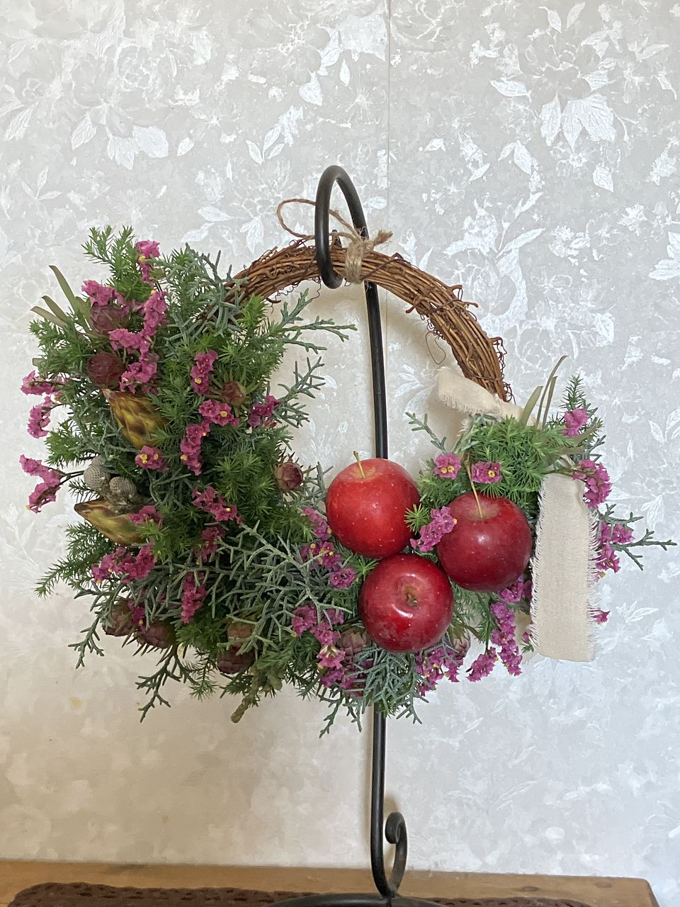 リースは何度か作りましたがハーフは初めてなのでちょっと心配でしたがなんとか作る事ができました。見本とずいぶん違うけど自分では良くできたかな。りんごは2個ワイヤーを使いましたが、1つは爪楊枝を刺して付けてみました。ユーカリが入っていたら嬉しかったかな。