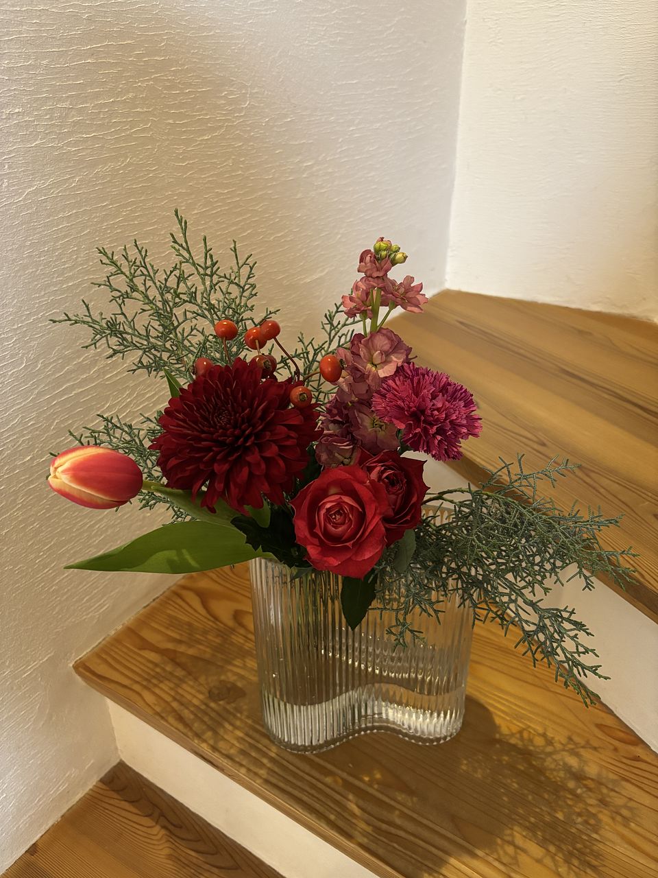 すごく綺麗な赤のお花たちでした。 気持ちまでクリスマスになり、早々にクリスマスソングをかけて家事を始めました。 いつも素敵なお花ありがとうございます。