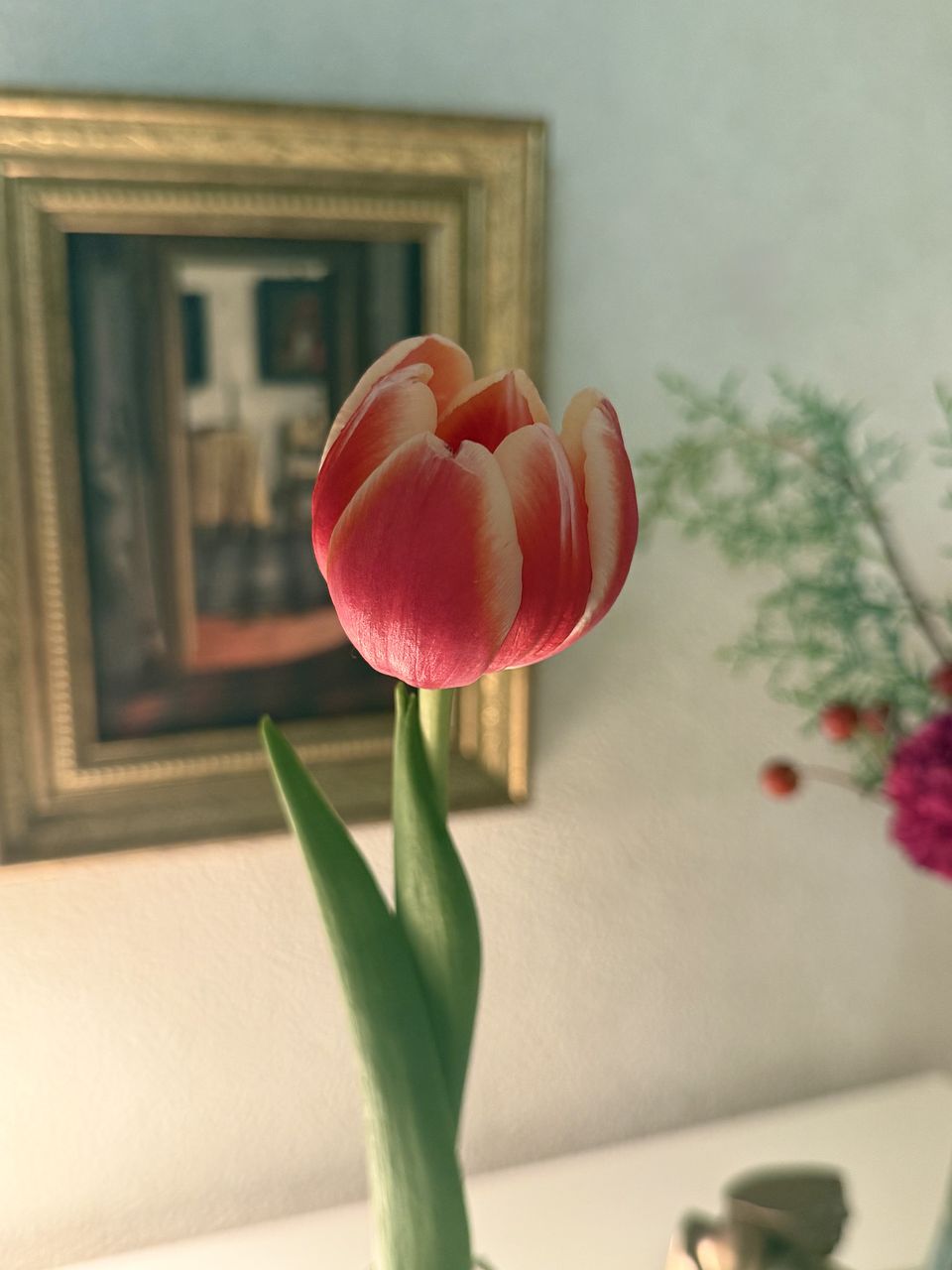 暗めの赤がインパクトあって素敵です。そのまま花瓶に入れて、かわいいです。チューリップが折れていたのは残念でしたが、最後まで楽しみます。