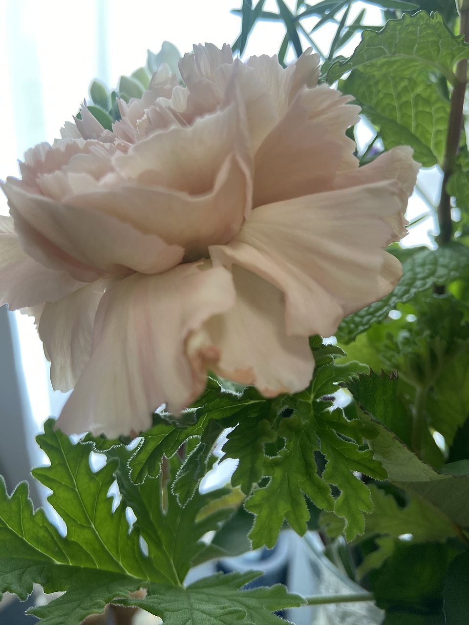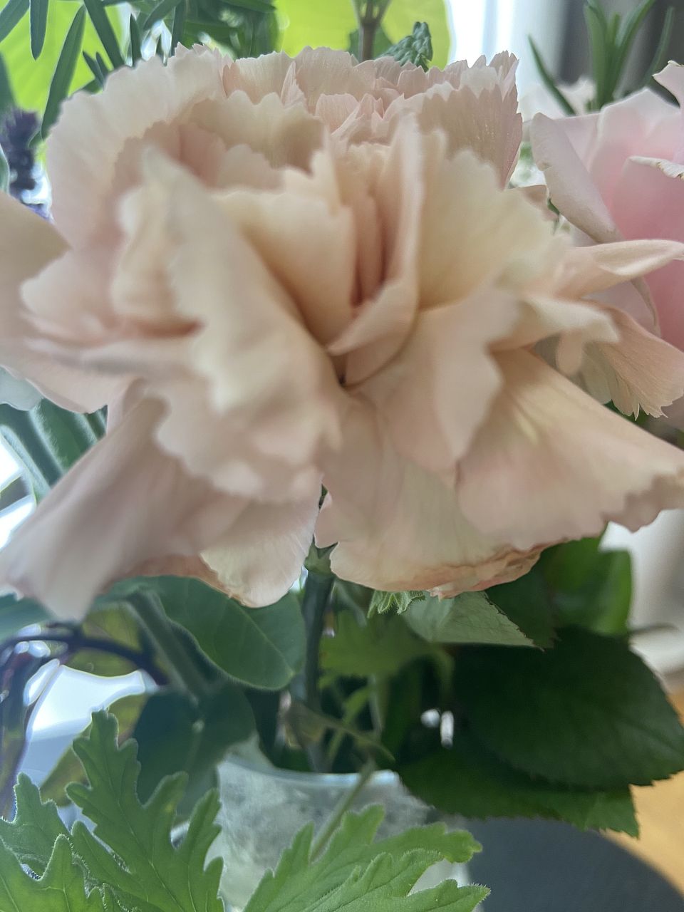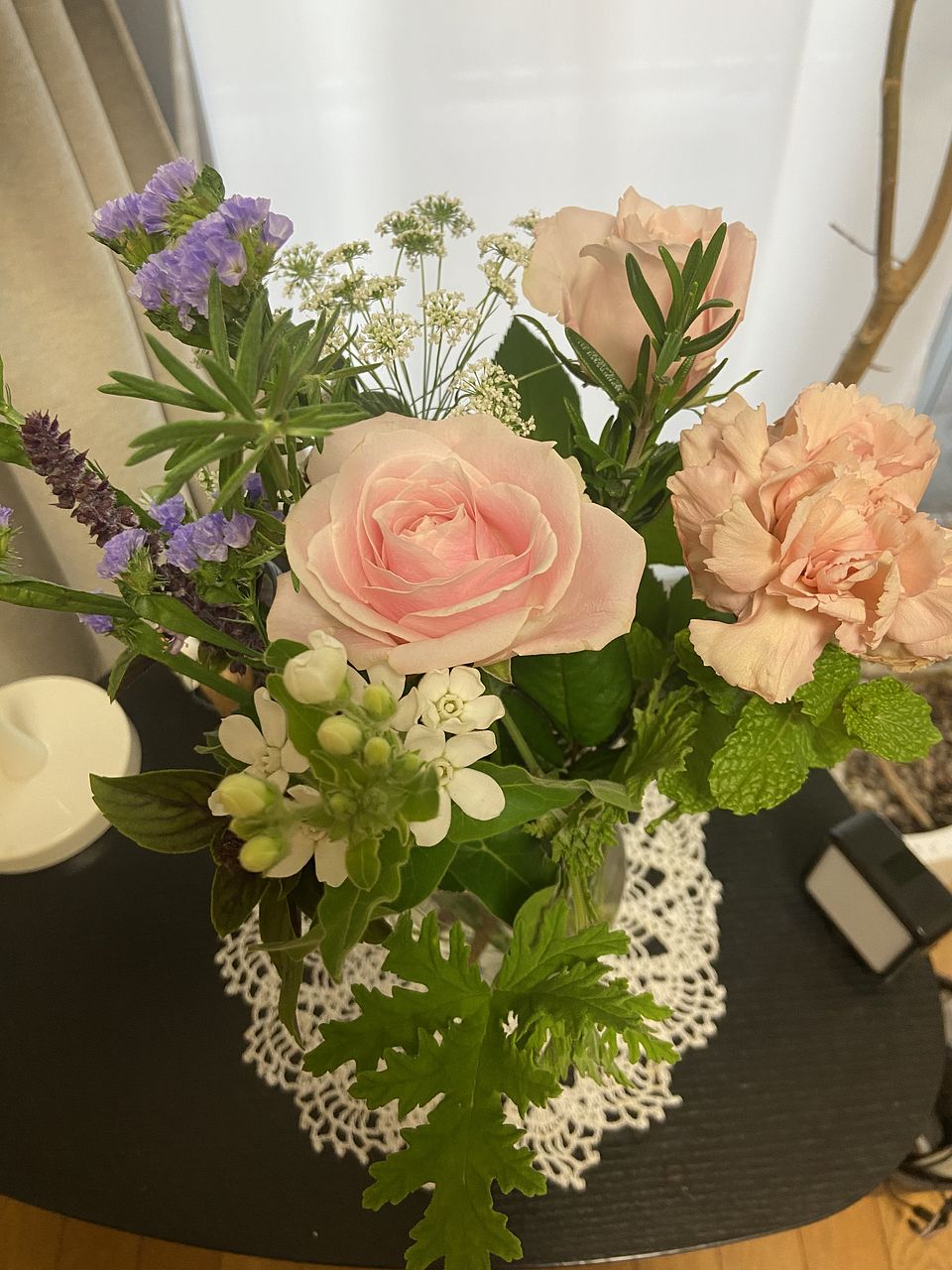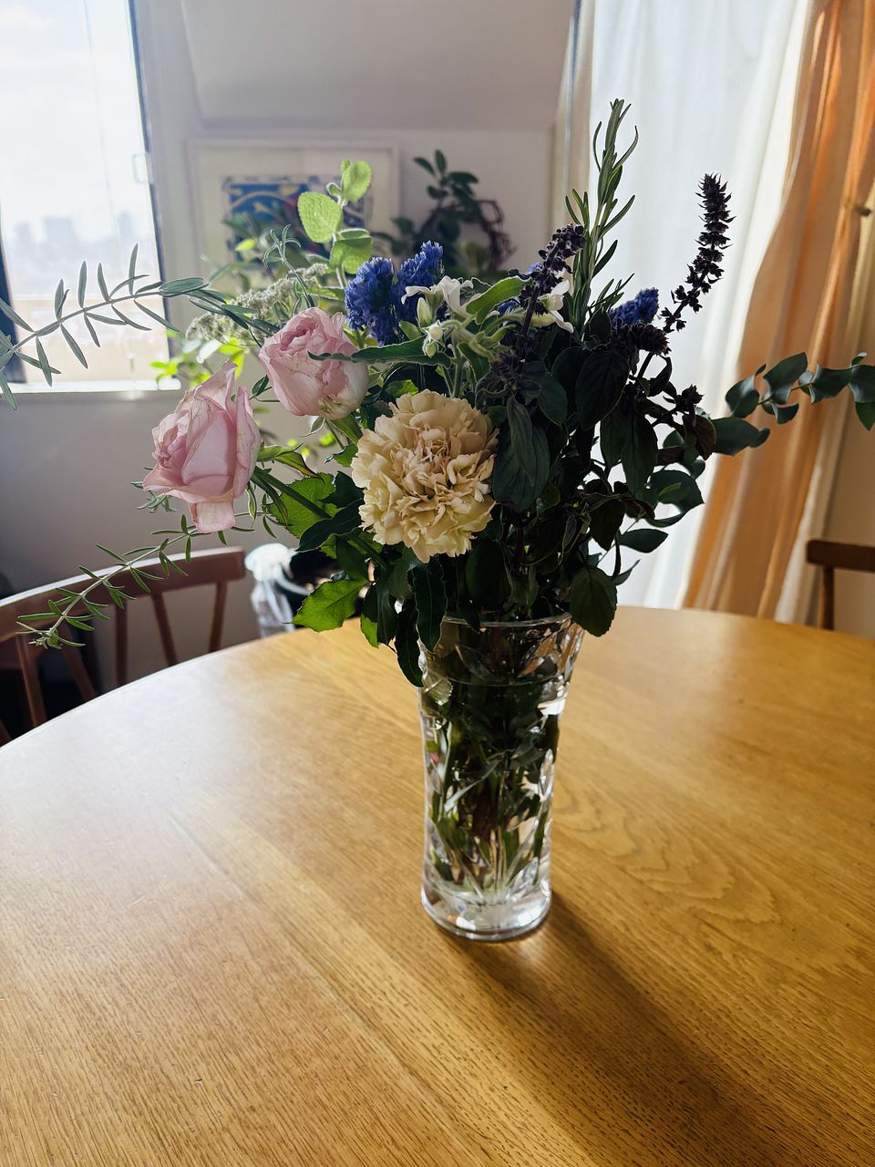 水揚げが上手くいき、3日経って花がだいぶ開きました。花はバラ2本とカーネーション1本と少ないですが、このブーケのメインであるハーブが沢山入っていたので満足です。皆さんの投稿写真が参考になるので助かります。