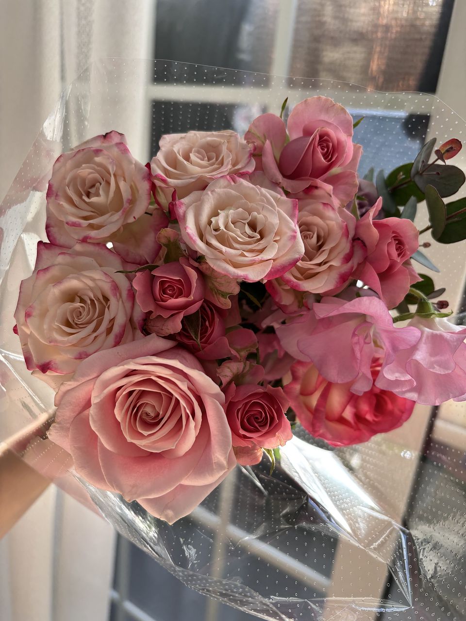開けたら良い香りで、バラとスイートピーちゃんが居ました🌹🌸 バラとスイートピーは同じくらい大好きなので嬉しい🫶 寒い日が続きますが春を感じさせる色合いで、見ていて幸せいっぱいです。 旦那さんのお誕生日お祝い用にでしたが、こちらにも幸せをお裾分けしてもらった気分になりました☺️