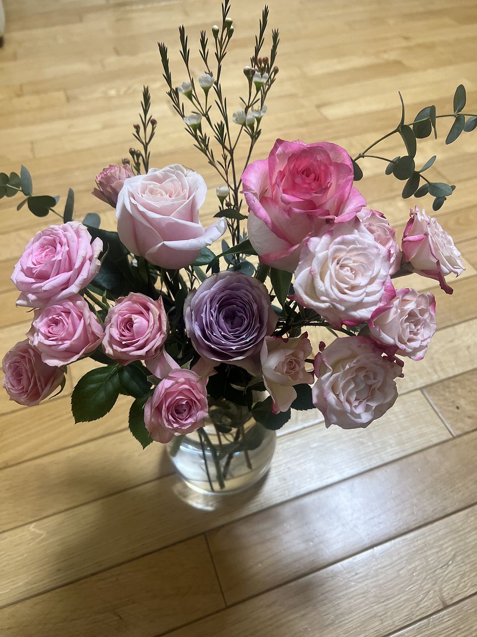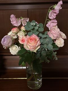 私の好きなピンク系の濃淡のバラ、スイトピーにユーカリのシルバーがかった葉っぱがよくマッチしていて、気に入りました。