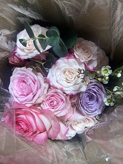 とても素敵な花束が届きました。 娘の誕生日プレゼント用に購入させていただきました。とても喜んでくれました。ピンク色のグラデーションが素敵で薔薇の花弁も可愛く、藤色とピンク色の花の柔らかな感じも素敵です。
