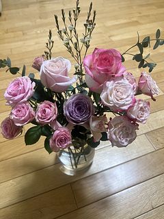 多くの種類のローズが入ってました。私の好きなパープルのローズも2本入っていてとても嬉しかったです。この後どのくらい元気でいてくれるか楽しみです。日々の生活に花がある喜びを香りと共に過ごせそうです✨(ハランは庭から追加しています)