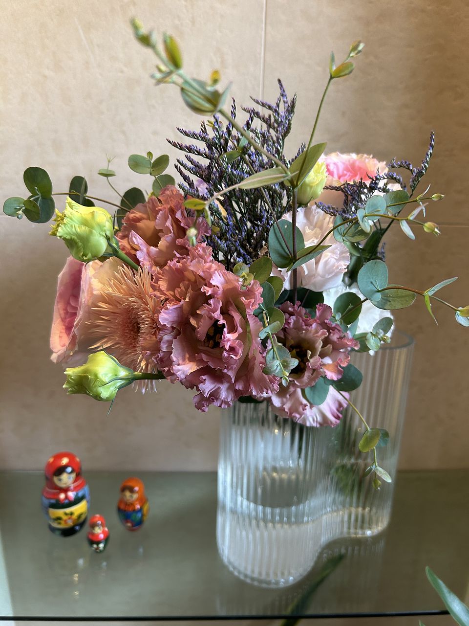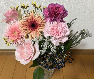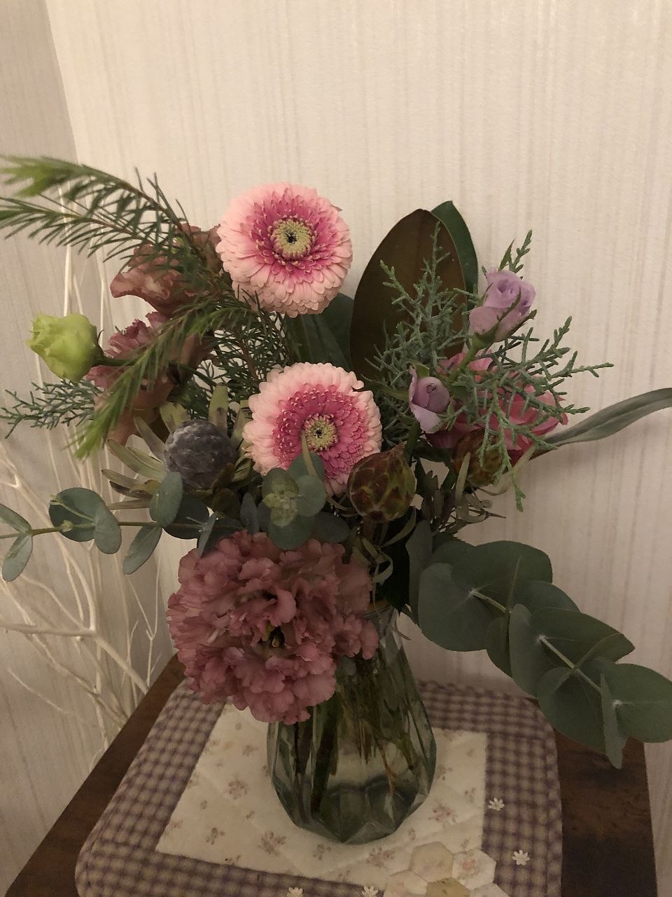 明るいピンクのブーケでとても可愛らしいです。 バラやトルコキキョウ、カーネーション、ガーベラとグリーンでボリュームたっぷりでした。 ここ最近で一番のヒットでした。