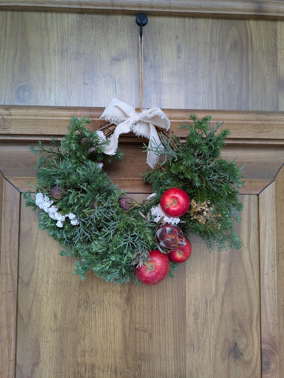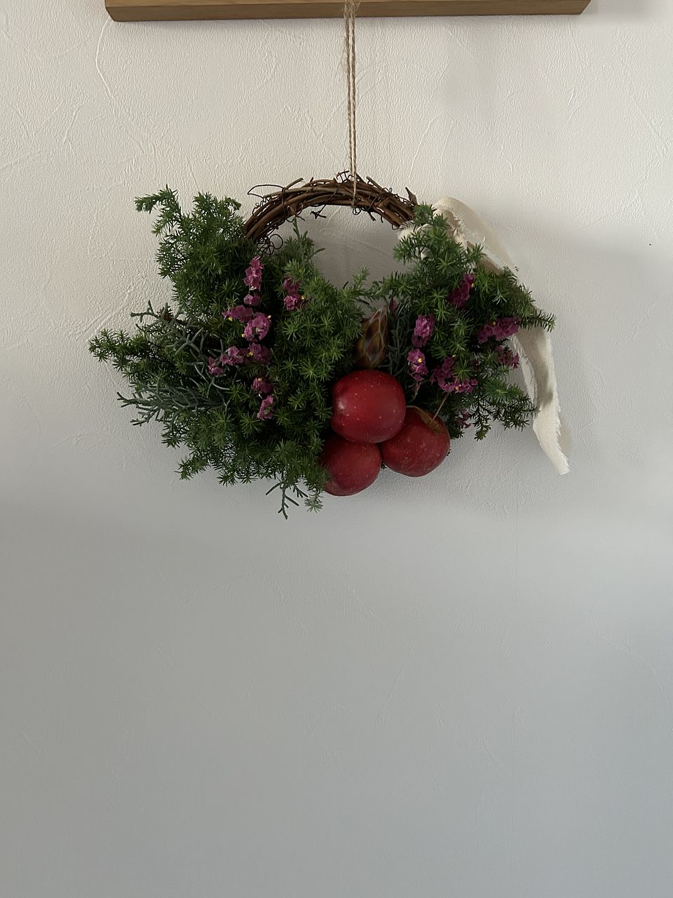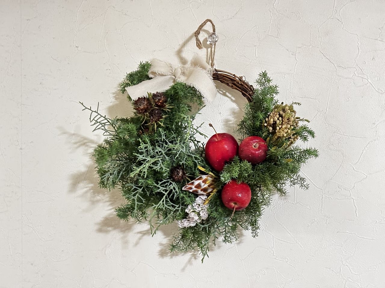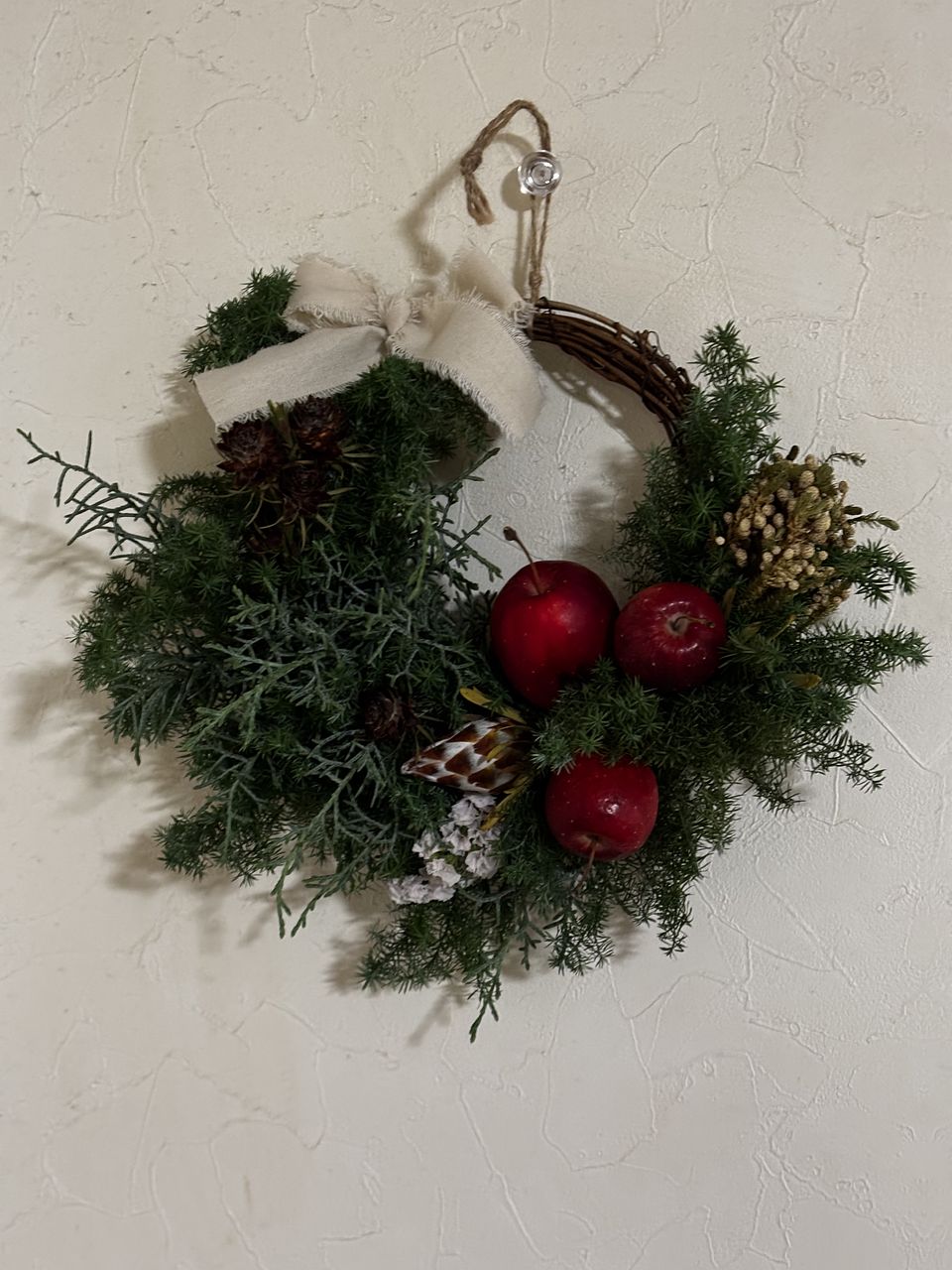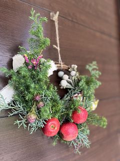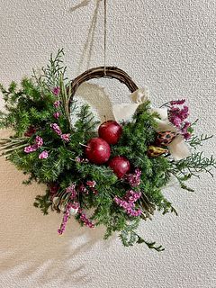リースは何度か作りましたがハーフは初めてなのでちょっと心配でしたがなんとか作る事ができました。見本とずいぶん違うけど自分では良くできたかな。りんごは2個ワイヤーを使いましたが、1つは爪楊枝を刺して付けてみました。ユーカリが入っていたら嬉しかったかな。