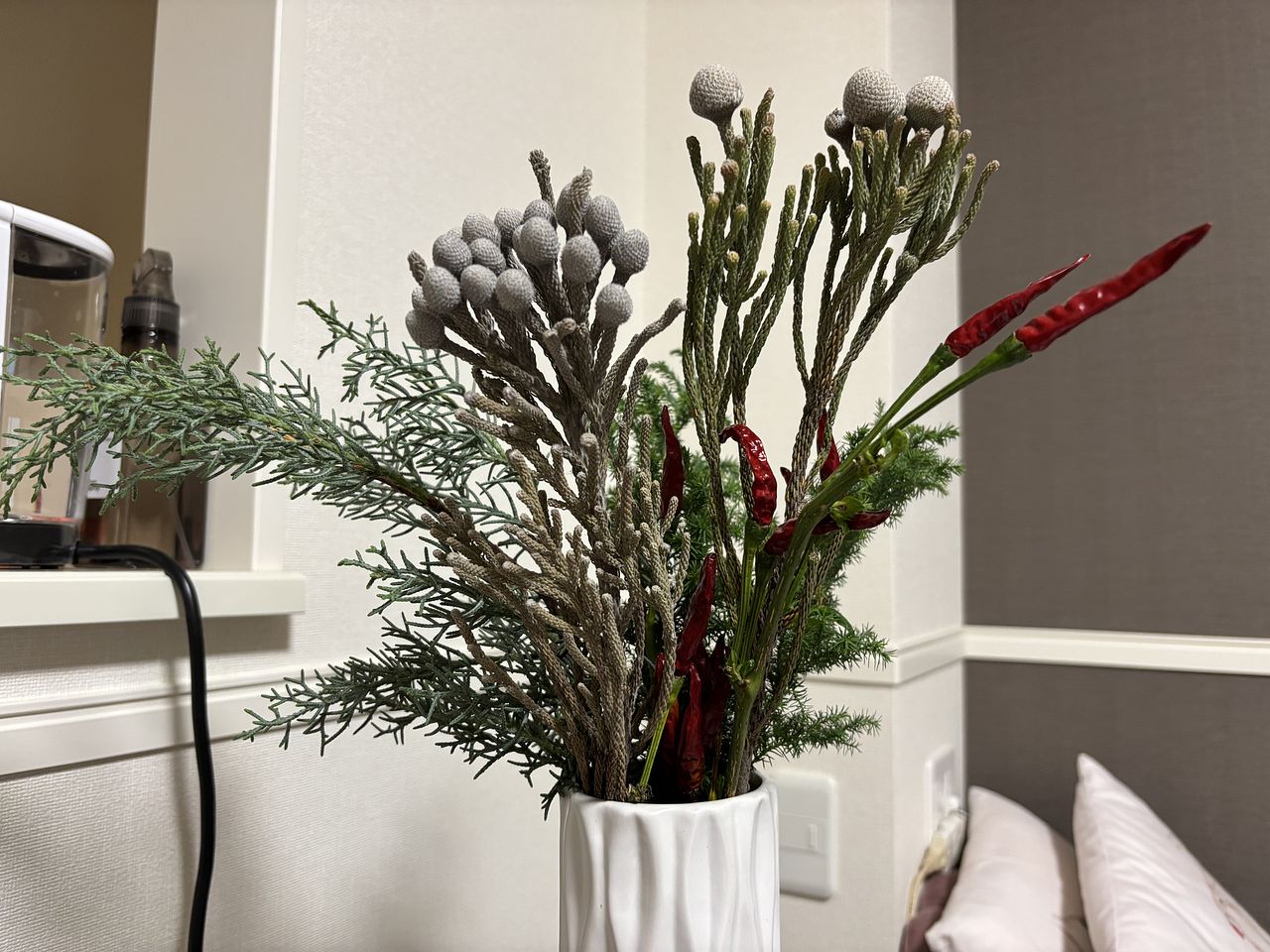 花材がとてもボリュームがありました。 朝届いて直ぐに作成。とても楽しいです☺ 家にあったタグをつけてみました。アレンジも楽しいです。 花材が余ったので家にあった唐辛子と小さなクリスマス飾りを作り花瓶にもさしました。